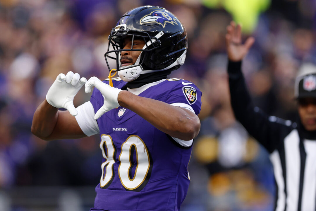 Dec 7 2025 Baltimore Maryland USA Baltimore Ravens tight end Isaiah Likely 80 reacts after scoring a touchdown against the Pittsburgh Steelers during the second half at M T Bank Stadium Mandatory Credit Peter Casey-Imagn Images