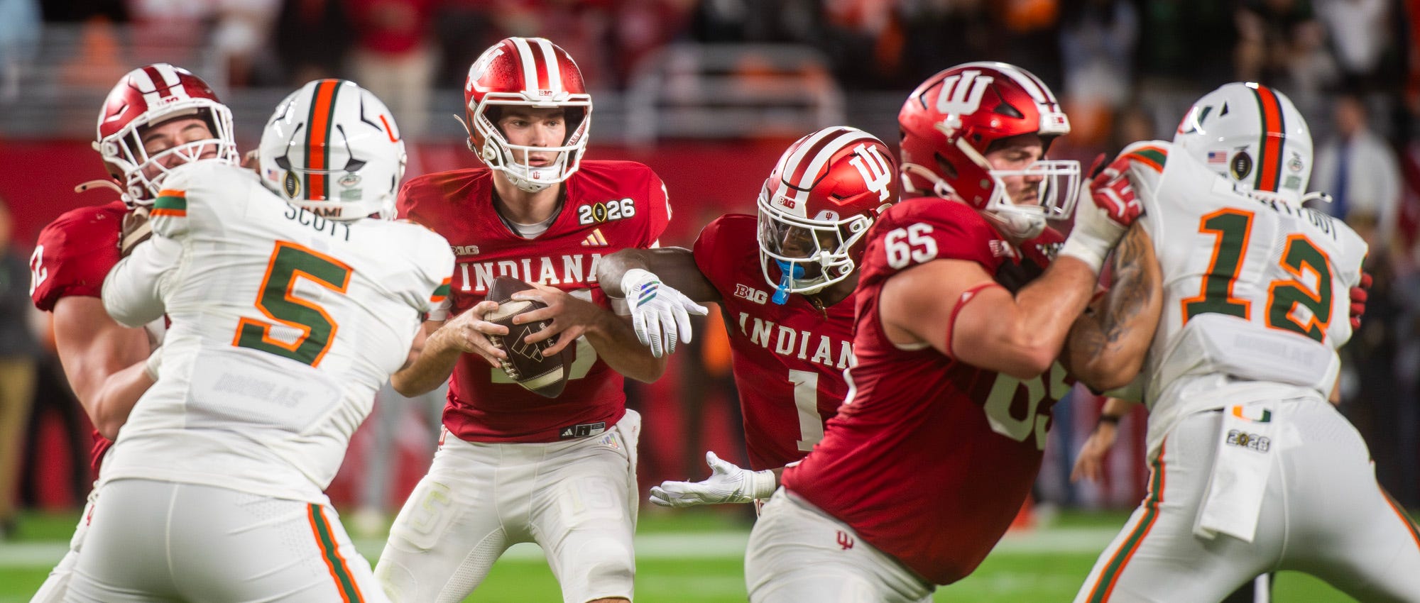 Indiana’s Fernando Mendoza (15) looks downfield as Roman Hemby (1) fakes the handoff during the College Football Playoff National Championship college football game at Hard Rock Stadium in Miami Gardens on Monday, Jan. 19, 2026. Mandatory Credit: Rich Janzaruk-Imagn Images
