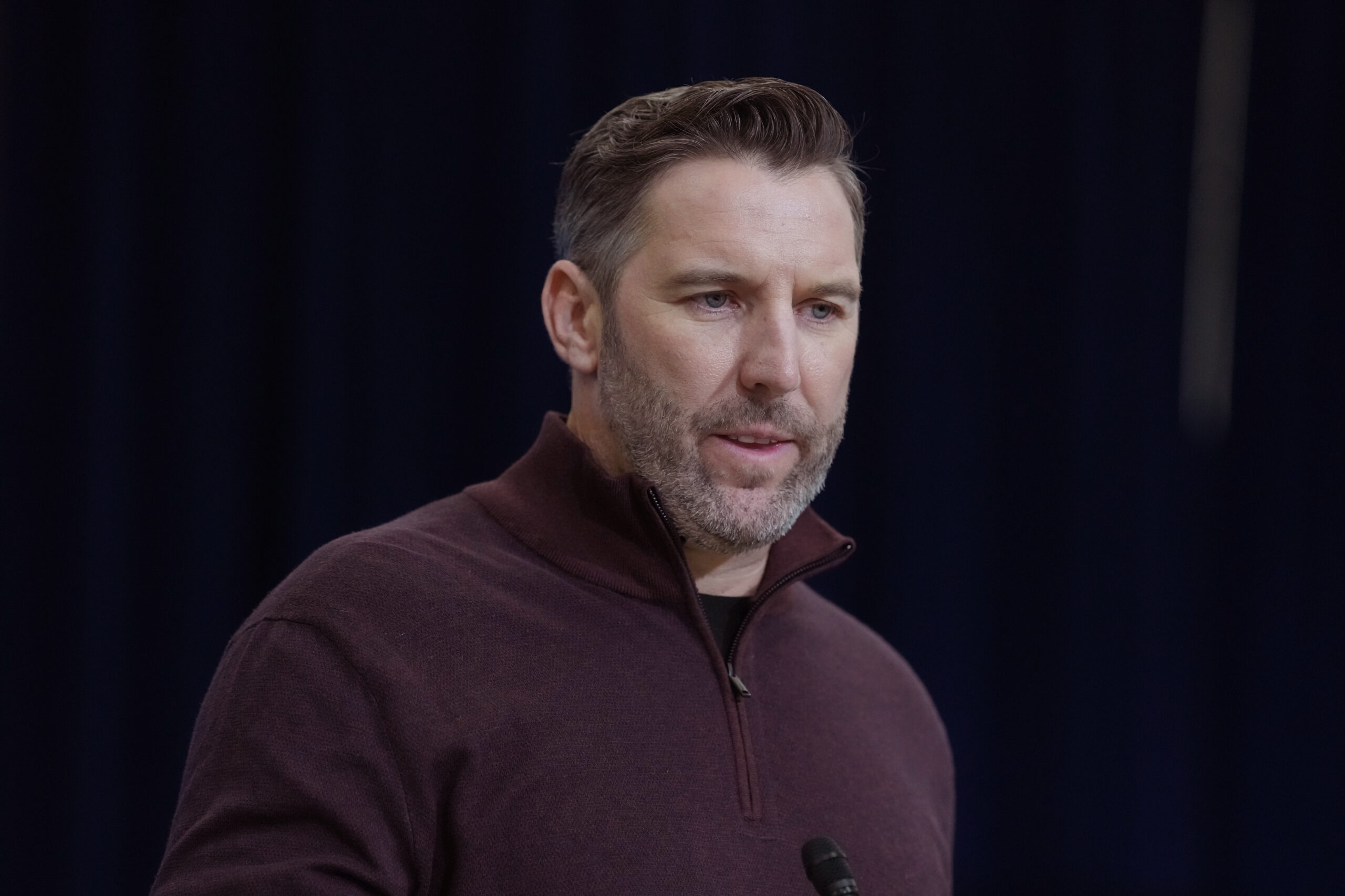 Feb 24, 2026; Indianapolis, IN, USA; Washington Commanders general manager Adam Peters speaks at the NFL Scouting Combine at the Indiana Convention Center. Mandatory Credit: Kirby Lee-Imagn Images
