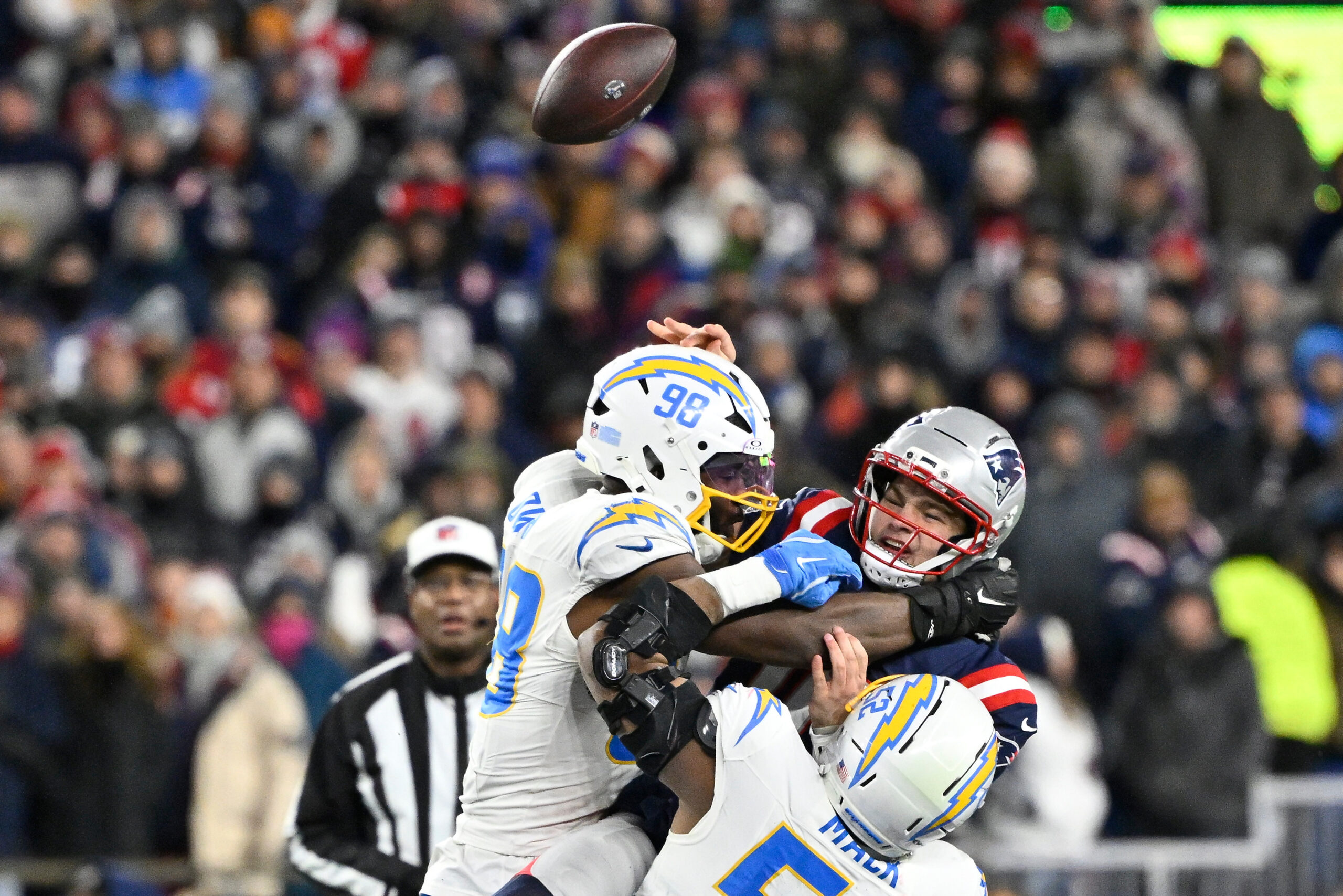 Jan 11, 2026; Foxborough, MA, USA; Los Angeles Chargers linebacker Odafe Oweh (98) and Los Angeles Chargers linebacker Khalil Mack (52) tackle New England Patriots quarterback Drake Maye (10) as he throws a pass during the second half in an AFC Wild Card Round game at Gillette Stadium. Mandatory Credit: Eric Canha-Imagn Images