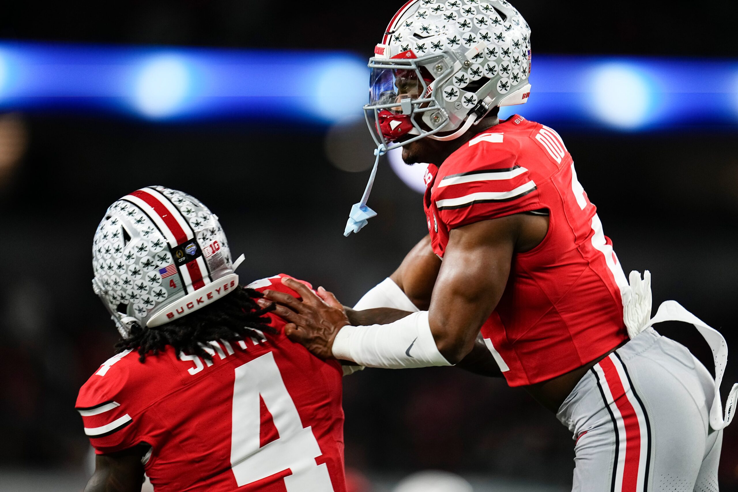 Ohio State Buckeyes defensive back Caleb Downs (2) celebrates with wide receiver Jeremiah Smith (4) during warm-ups prior to the Cotton Bowl at AT&T Stadium in Arlington, Texas for the College Football Playoff quarterfinal game against the Miami Hurricanes on Dec. 31, 2025.