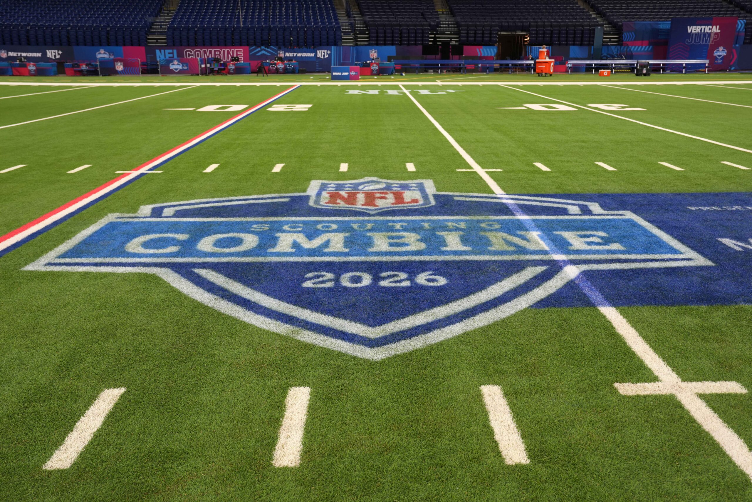 Mar 1, 2026; Indianapolis, IN, USA; The NFL Scouting Combine logo on the field at Lucas Oil Stadium. Mandatory Credit: Kirby Lee-Imagn Images