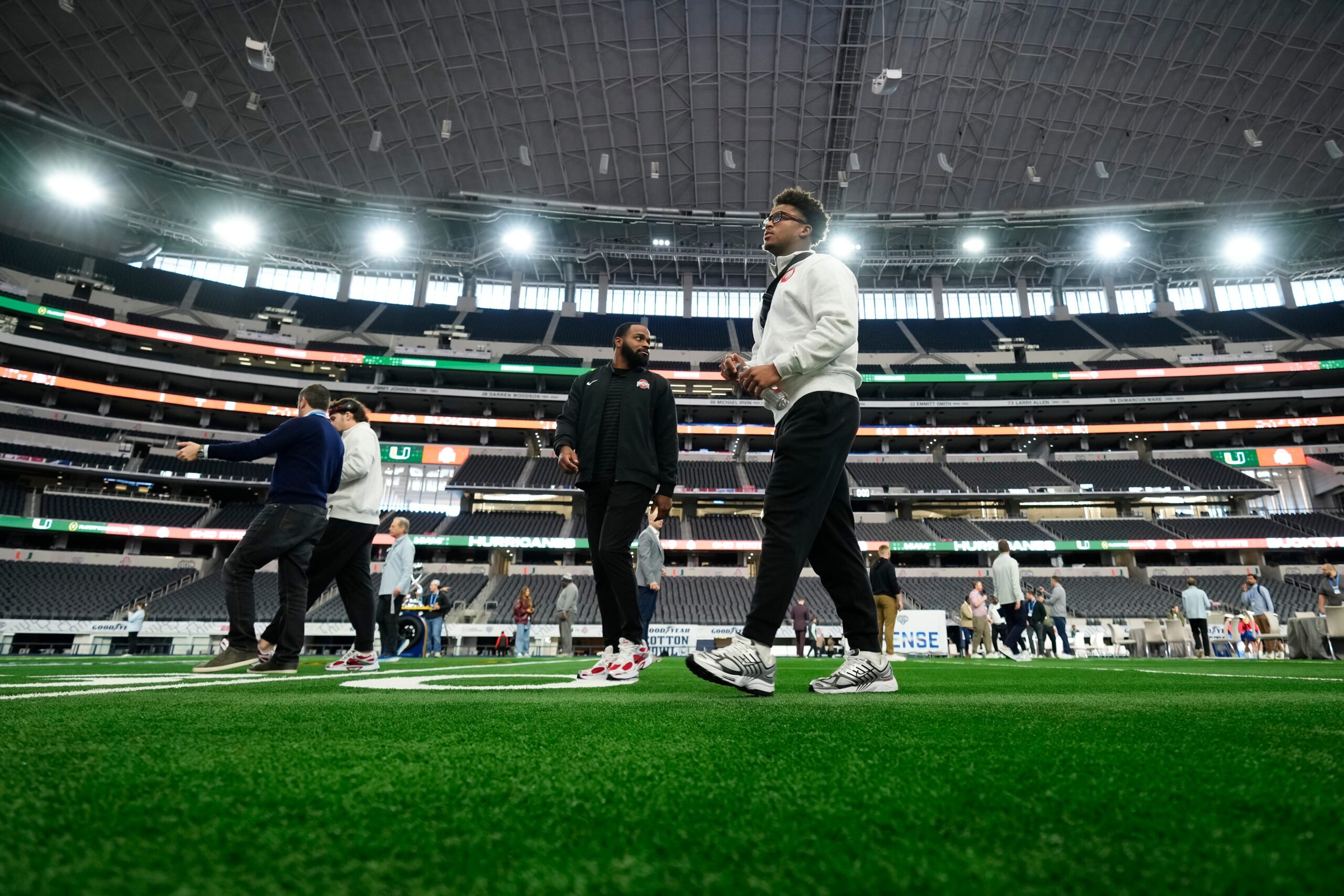 Ohio State Buckeyes defensive back Caleb Downs leaves the field following the Cotton Bowl Media Day at AT&T Stadium in Dallas prior to the College Football Playoff matchup against the Miami Hurricanes on Dec. 29, 2025.