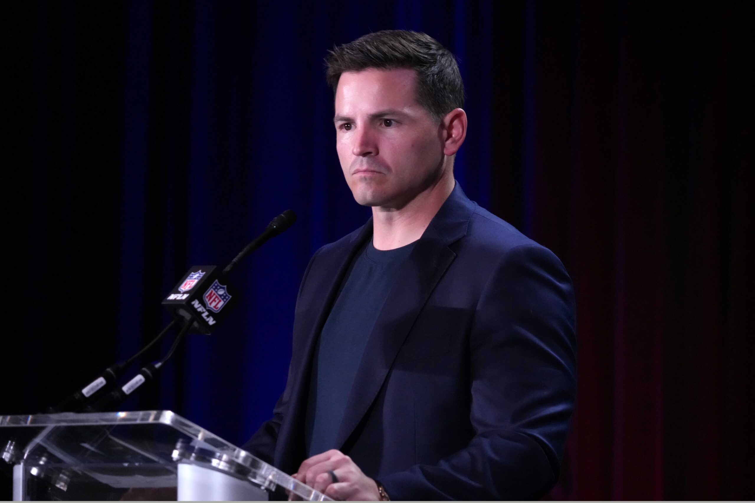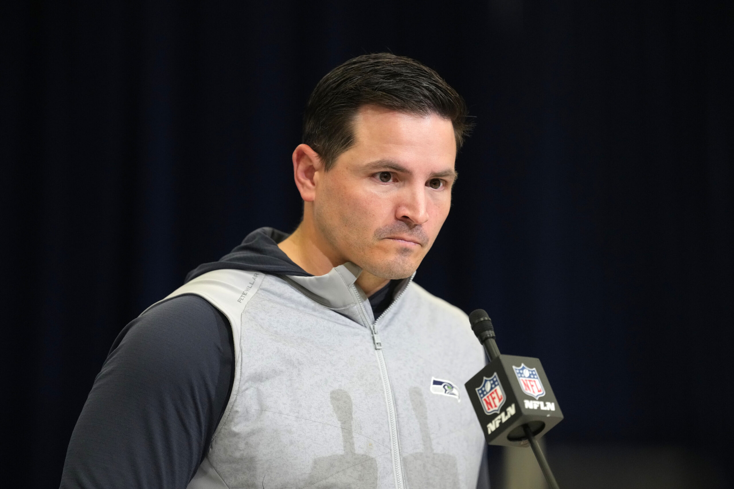 Feb 25, 2026; Indianapolis, IN, USA; Seattle Seahawks coach Mike Macdonald speaks during the NFL Scouting Combine at the Indiana Convention Center. Mandatory Credit: Kirby Lee-Imagn Images