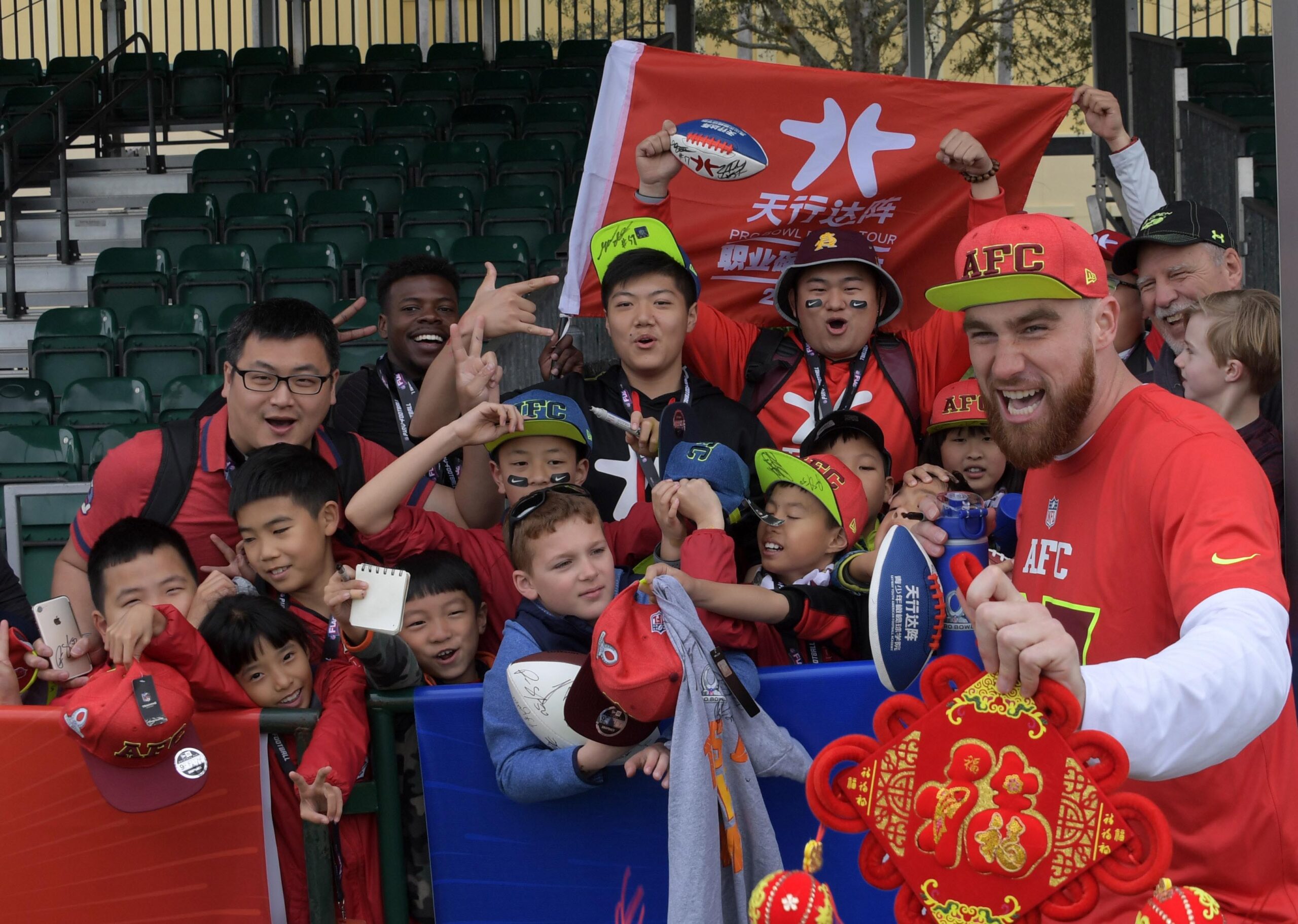 Jan 27, 2017; Kissimmee, FL, USA; AFC tight end Travis Kelce of the Kansas City Chiefs (87) poses with fans during practice for the 2017 Pro Bowl at ESPN Wide World of Sports Complex. Mandatory Credit: Kirby Lee-Imagn Images