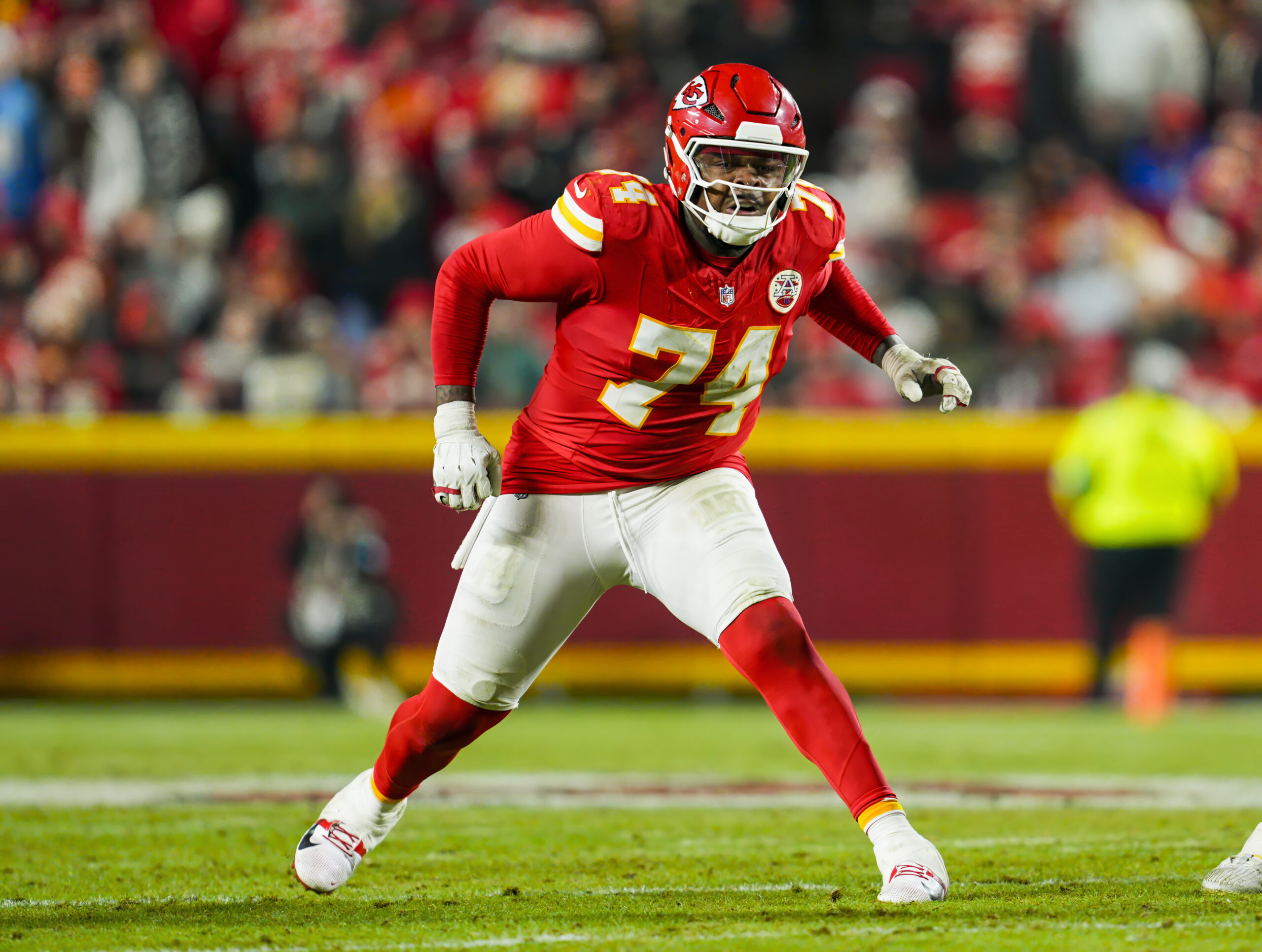Dec 8, 2024; Kansas City, Missouri, USA; Kansas City Chiefs offensive tackle Jawaan Taylor (74) gets ready to block during the second half against the Los Angeles Chargers at GEHA Field at Arrowhead Stadium. Mandatory Credit: Jay Biggerstaff-Imagn Images