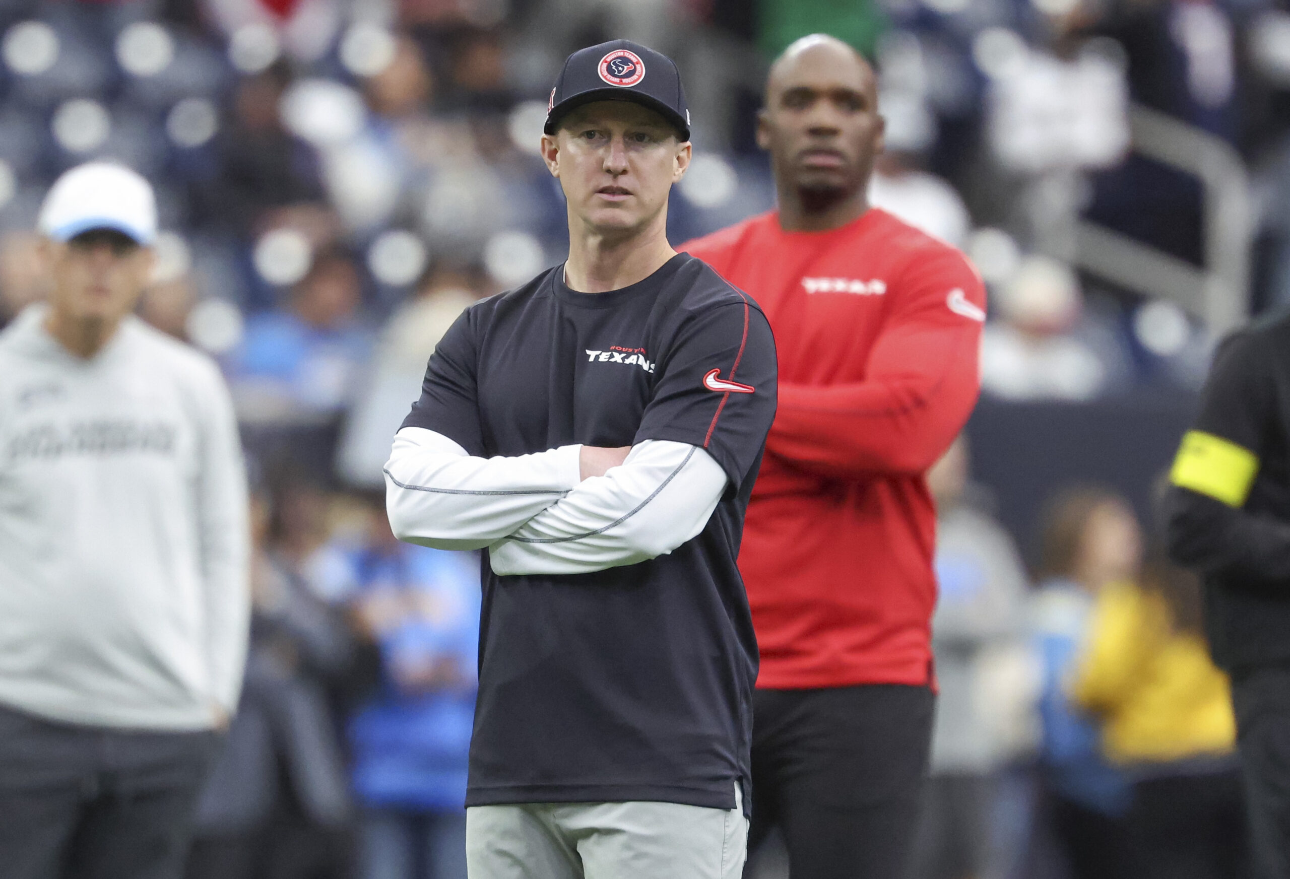 Jan 11, 2025; Houston, Texas, USA; Houston Texans offensive coordinator Bobby Slowik and head coach DeMeco Ryans look on before the game against the Los Angeles Chargers in an AFC wild card game at NRG Stadium. Mandatory Credit: Troy Taormina-Imagn Images