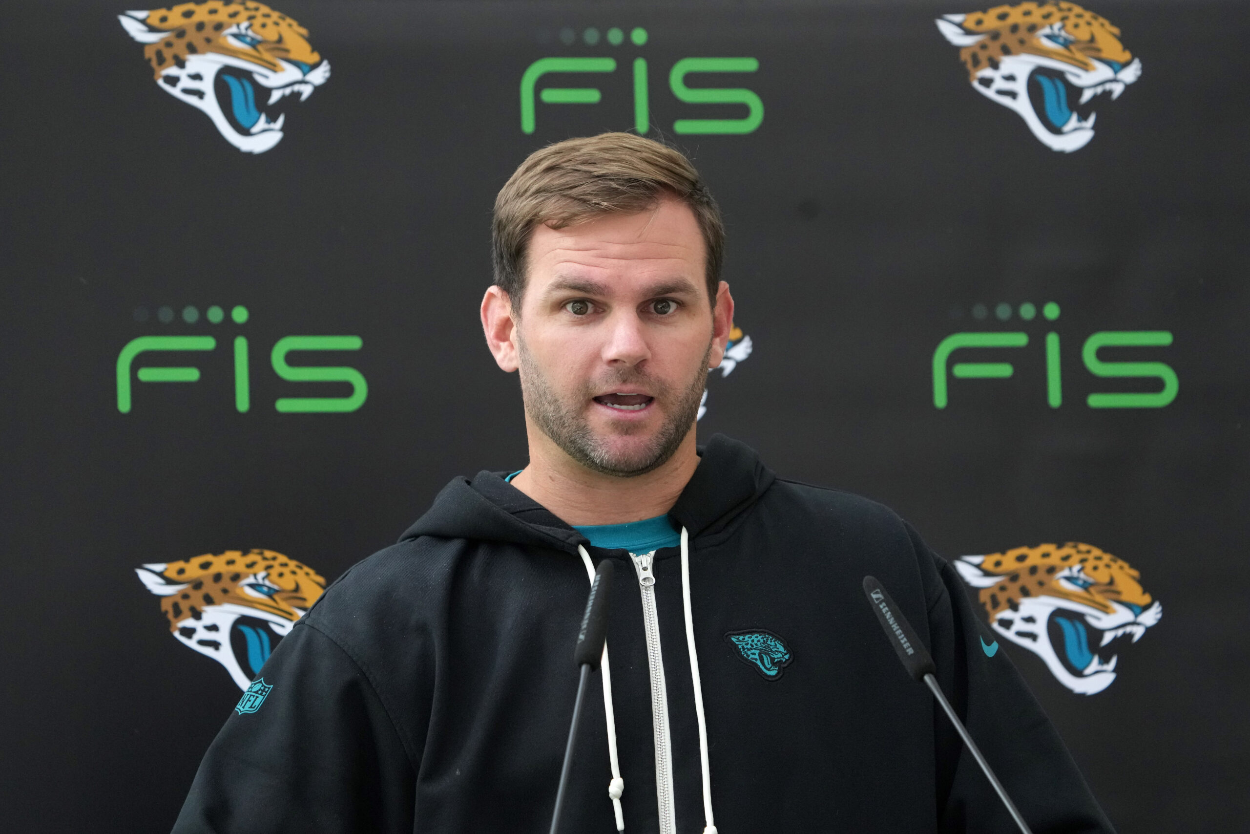 Oct 17, 2024; Watford, United Kingdom; Jacksonville Jaguars offensive coordinator Press Taylor during press conference at The Grove. Mandatory Credit: Kirby Lee-Imagn Images