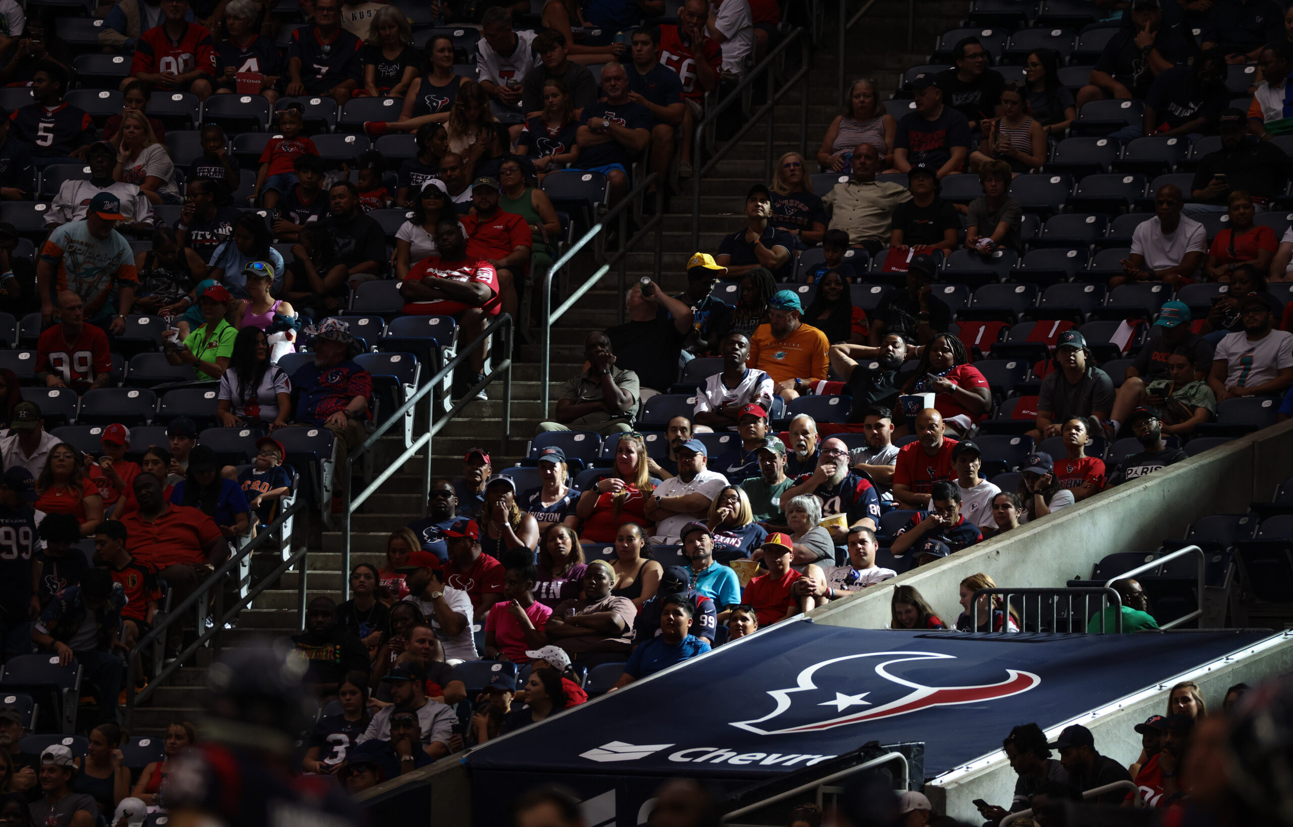 Aug 19, 2023; Houston, Texas, USA; Sun streams on the fans as the Houston Texans play the Miami Dolphins in the third quarter at NRG Stadium. Mandatory Credit: Thomas Shea-Imagn Images