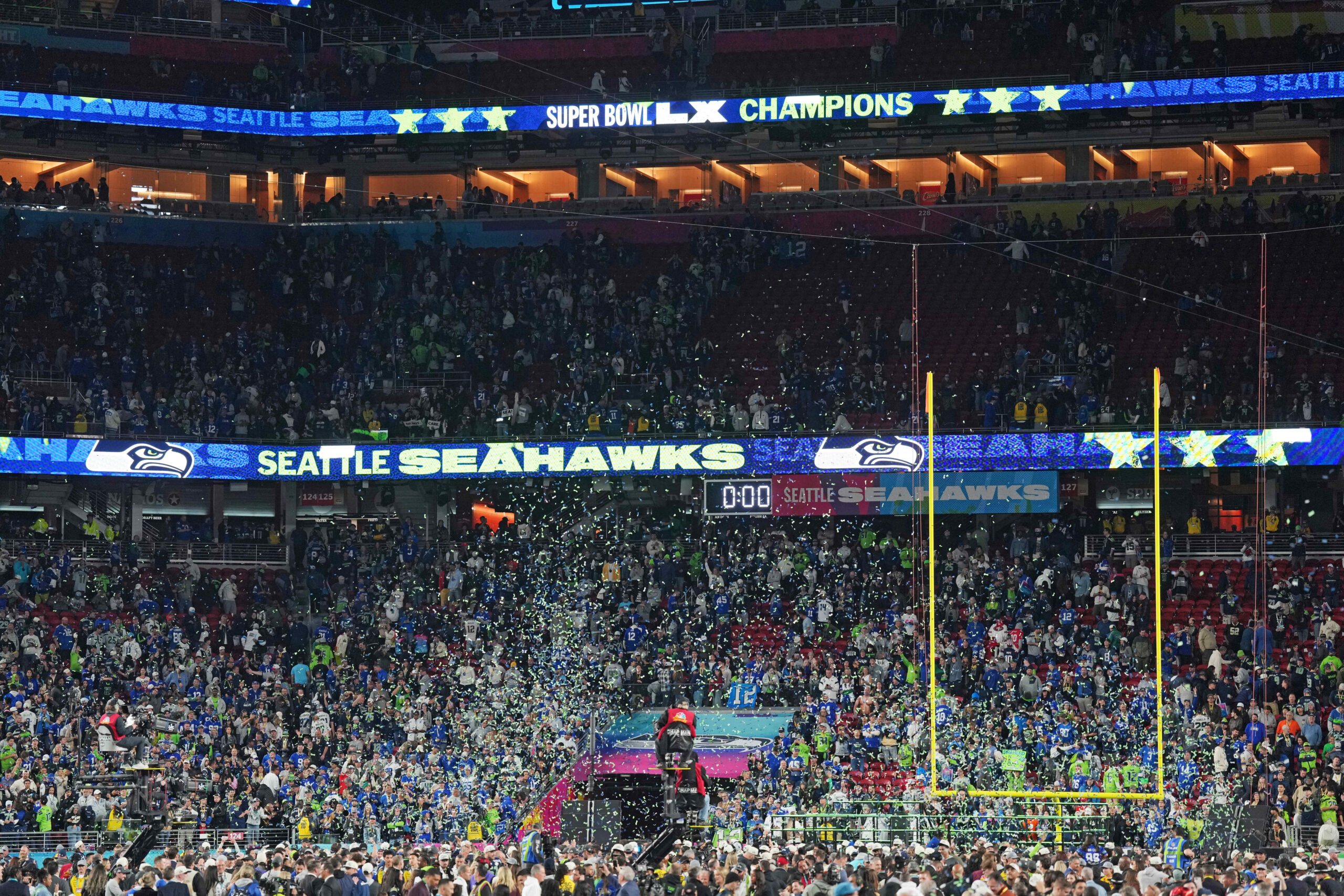 Feb 8, 2026; Santa Clara, CA, USA; Fans celebrate after the game between the New England Patriots and Seattle Seahawks in Super Bowl LX at Levi’s Stadium. Mandatory Credit: Darren Yamashita-Imagn Images