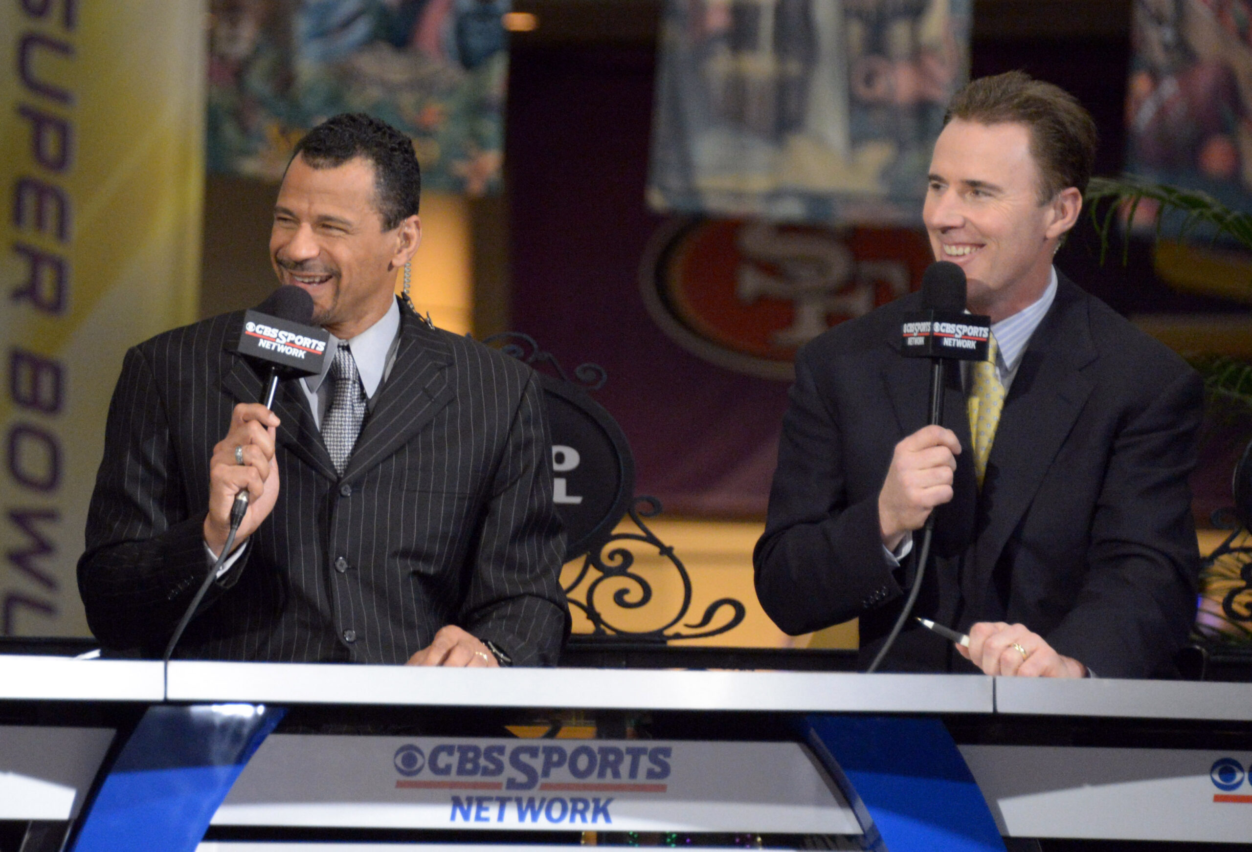 Jan 29, 2013, New Orleans, LA, USA; Rod Woodson (left) and David Berson on the CBS sports network set at the Super Bowl XLVII media center at the New Orleans Ernest N. Morial Convention Center. Mandatory Credit: Kirby Lee-Imagn Images