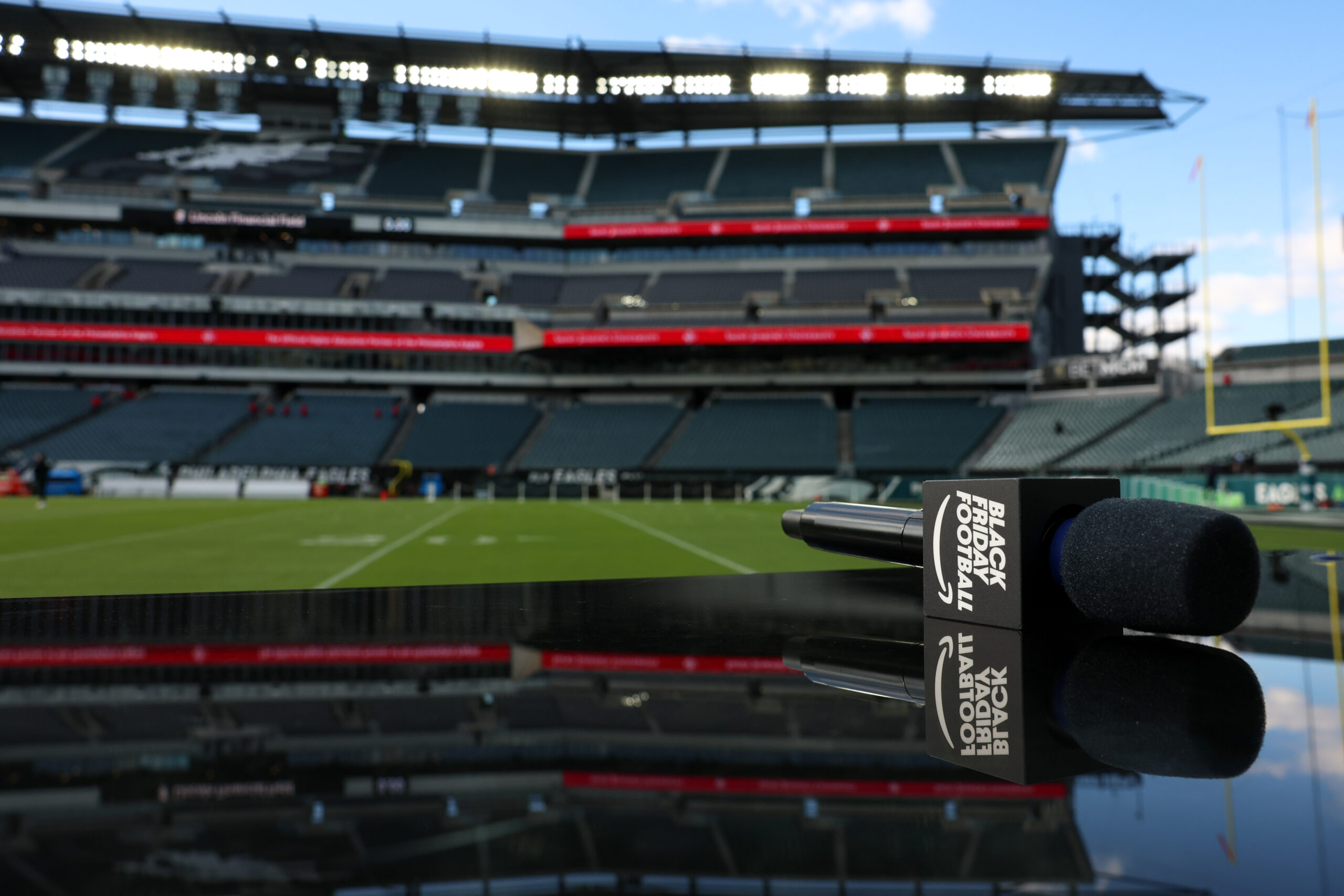Nov 28, 2025; Philadelphia, Pennsylvania, USA; The sideline set for the Black Friday Football broadcast is seen prior to the game between the Chicago Bears and the Philadelphia Eagles at Lincoln Financial Field. Mandatory Credit: Bill Streicher-Imagn Images