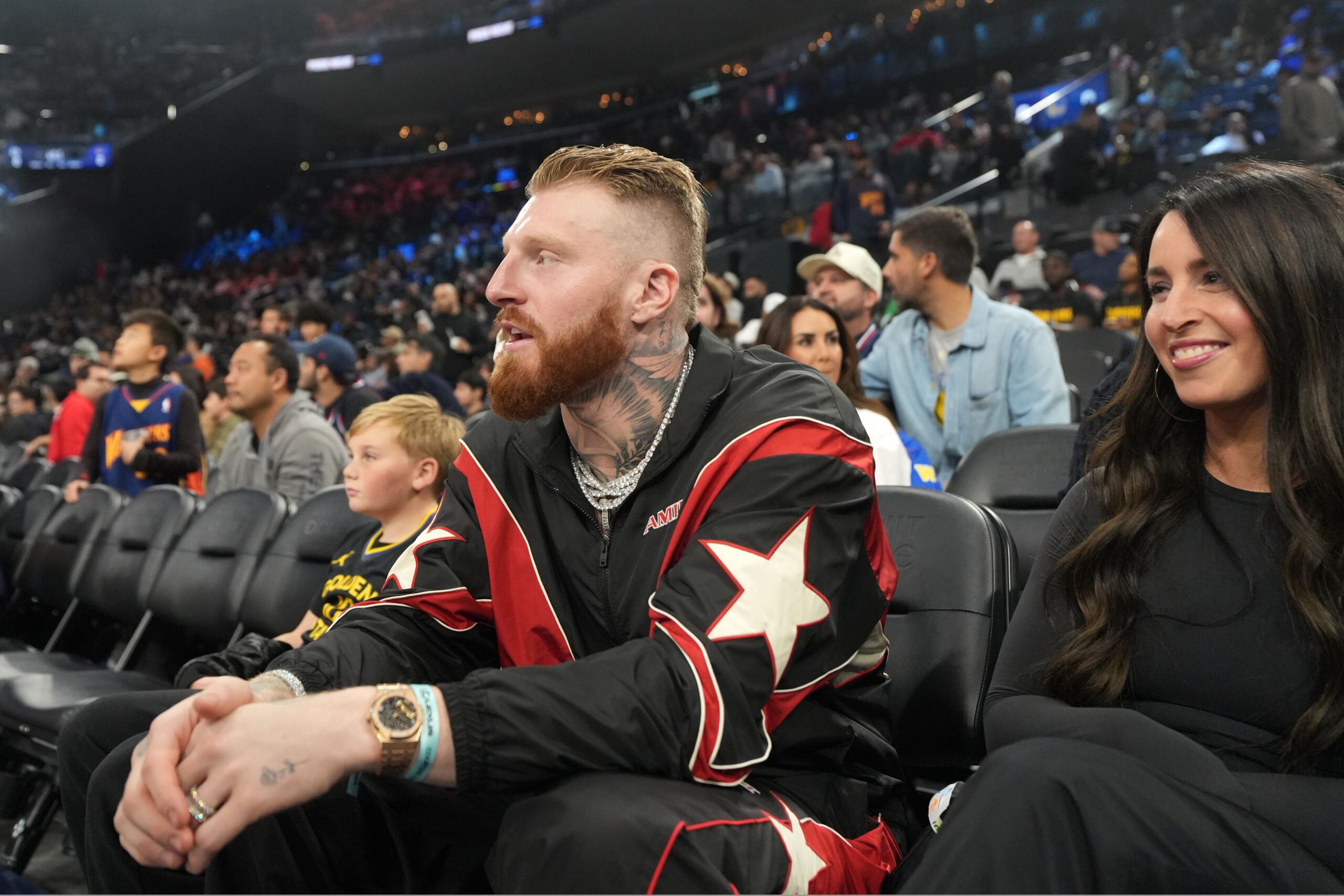 Jan 5, 2026; Inglewood, California, USA; Las Vegas Raiders defensive end Maxx Crosby (left) and wife Rachel Washburn attend the game between the Golden State Warriors and the LA Clippers at the Intuit Dome. Mandatory Credit: Kirby Lee-Imagn Images