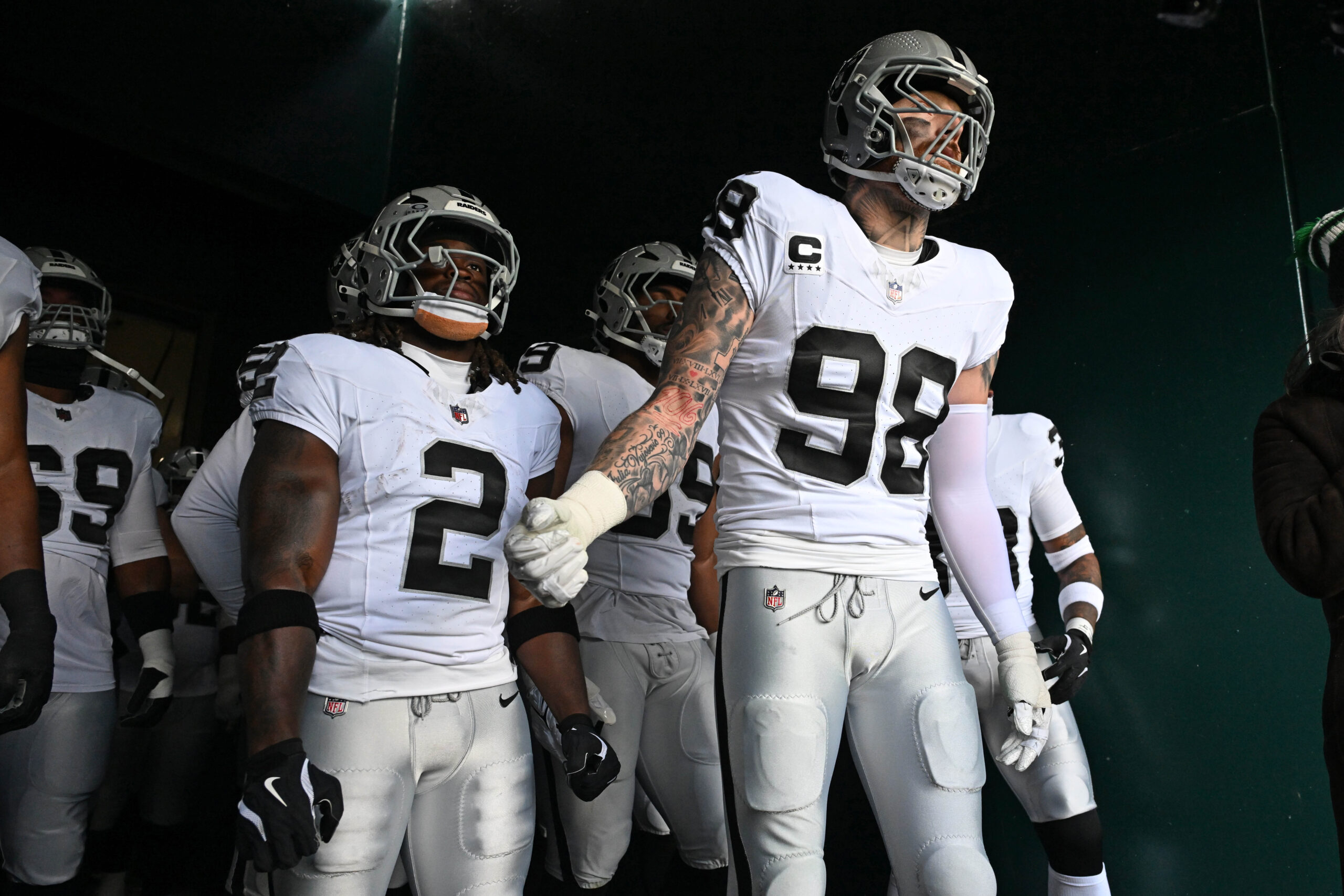 Dec 14, 2025; Philadelphia, Pennsylvania, USA; Las Vegas Raiders defensive end Maxx Crosby (98) on the field after loss to the Philadelphia Eagles at Lincoln Financial Field. Mandatory Credit: Eric Hartline-Imagn Images