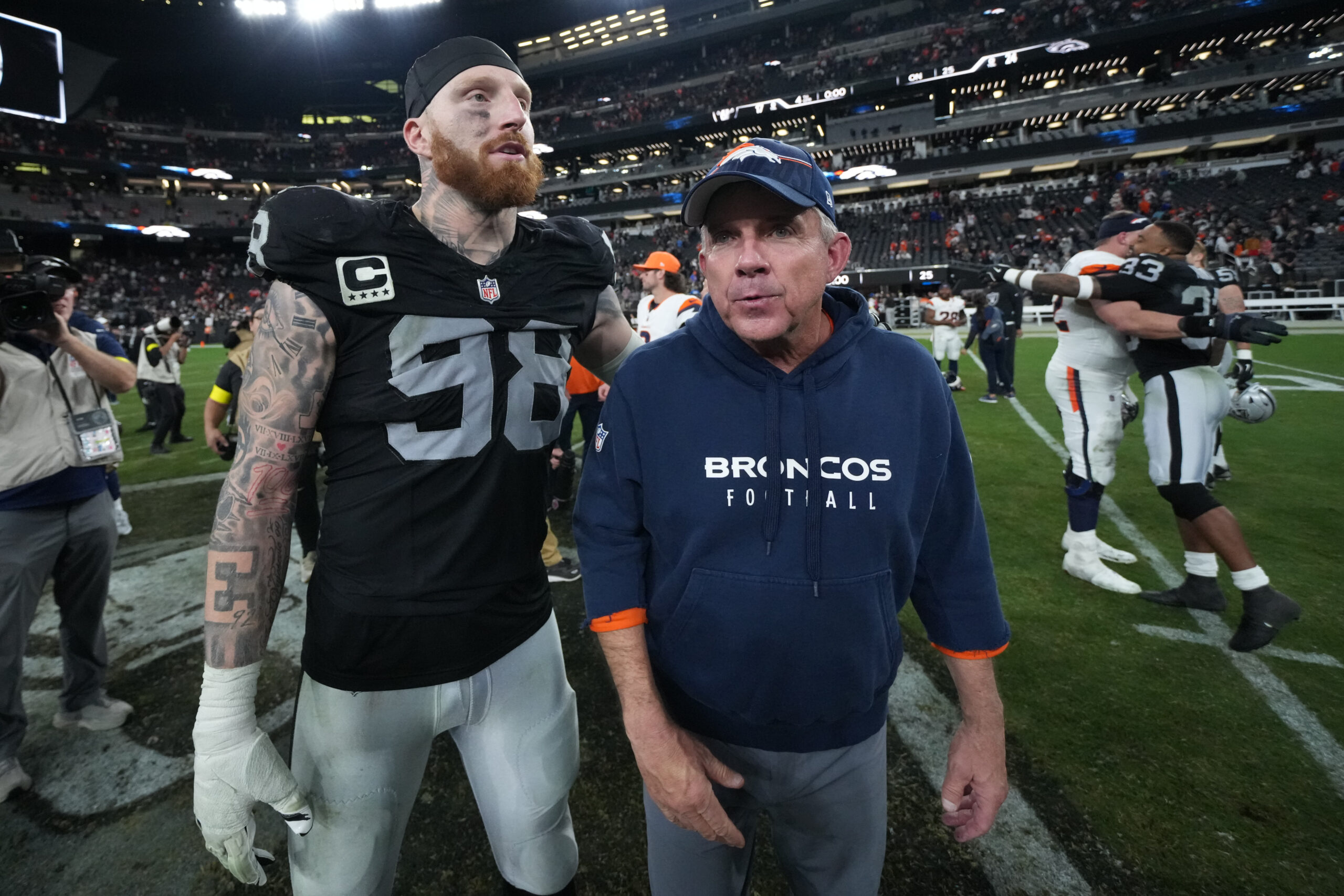 Dec 7, 2025; Paradise, Nevada, USA; Las Vegas Raiders defensive end Maxx Crosby (98) and Denver Broncos head coach Sean Payton meet on the field following a game at Allegiant Stadium. Mandatory Credit: Kirby Lee-Imagn Images