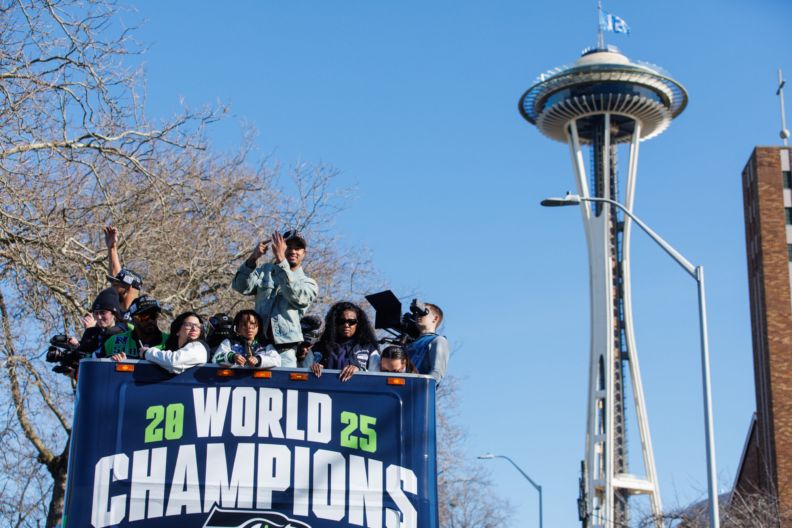 Feb 11, 2026; Seattle, WA, USA; Seattle Seahawks wide receiver Jaxon Smith-Njigba (11) reacts during the Super Bowl LX parade. Mandatory Credit: Kevin Ng-Imagn Images