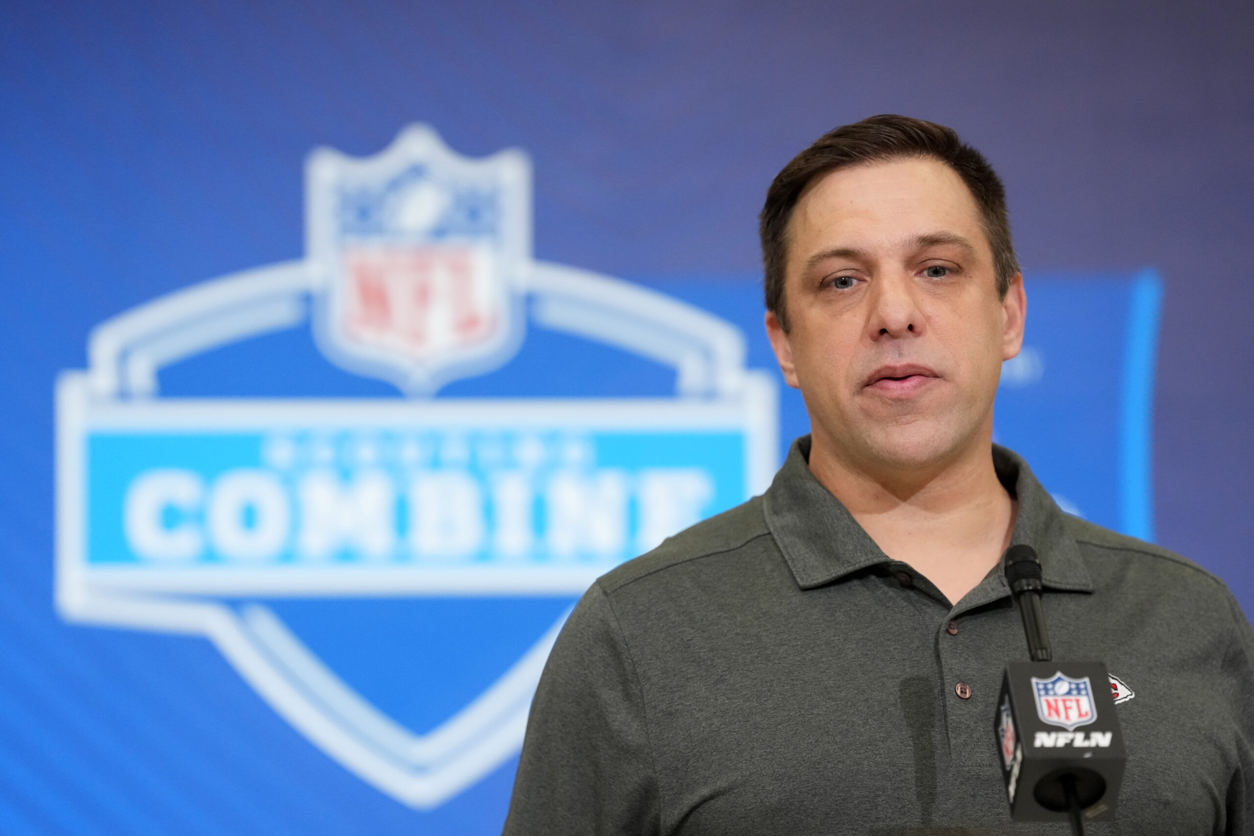 Feb 24, 2026; Indianapolis, IN, USA; Kansas City Chiefs general manager Brett Veach speaks at the NFL Scouting Combine at the Indiana Convention Center. Mandatory Credit: Kirby Lee-Imagn Images