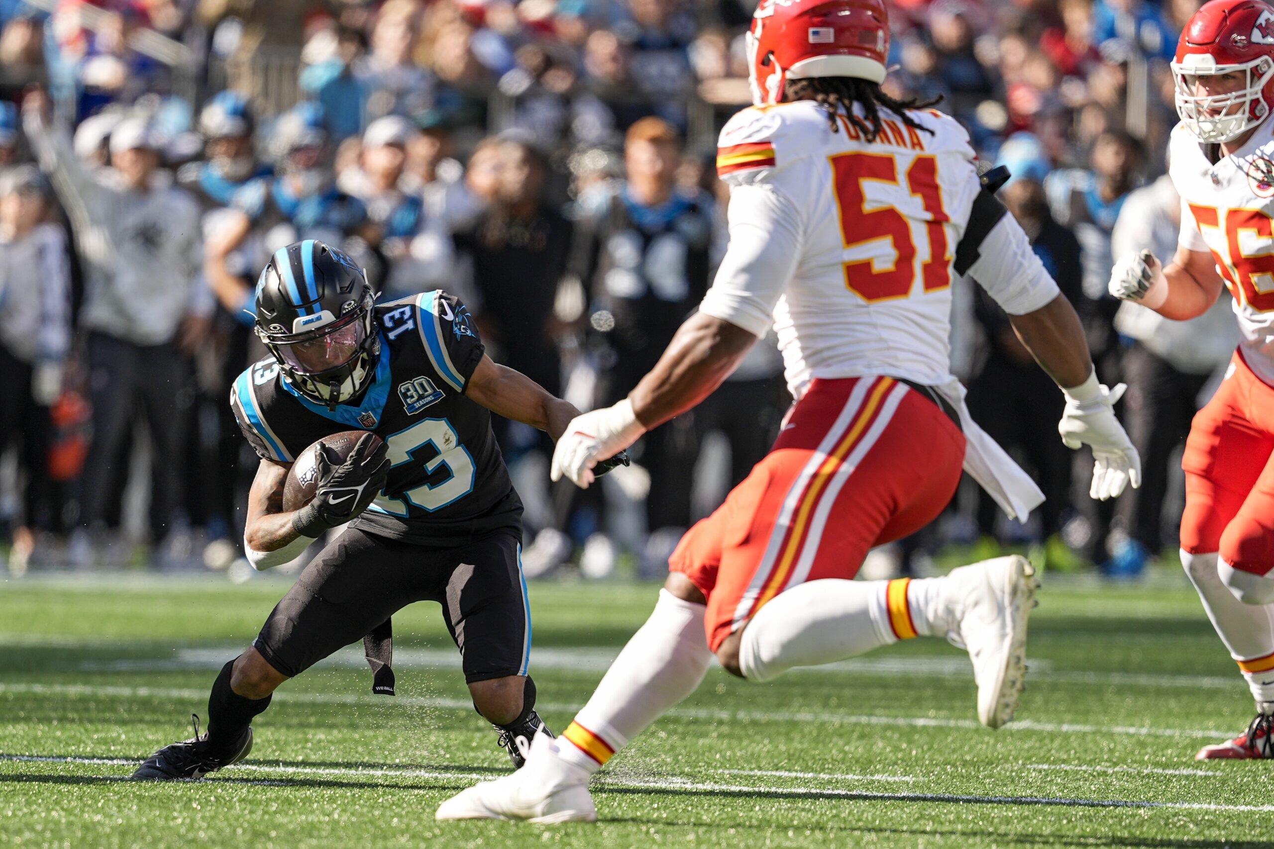 Nov 24, 2024; Charlotte, North Carolina, USA; Carolina Panthers wide receiver Deven Thompkins (13) runs the ball against Kansas City Chiefs defensive end Mike Danna (51) during the first quarter at Bank of America Stadium. Mandatory Credit: Jim Dedmon-Imagn Images