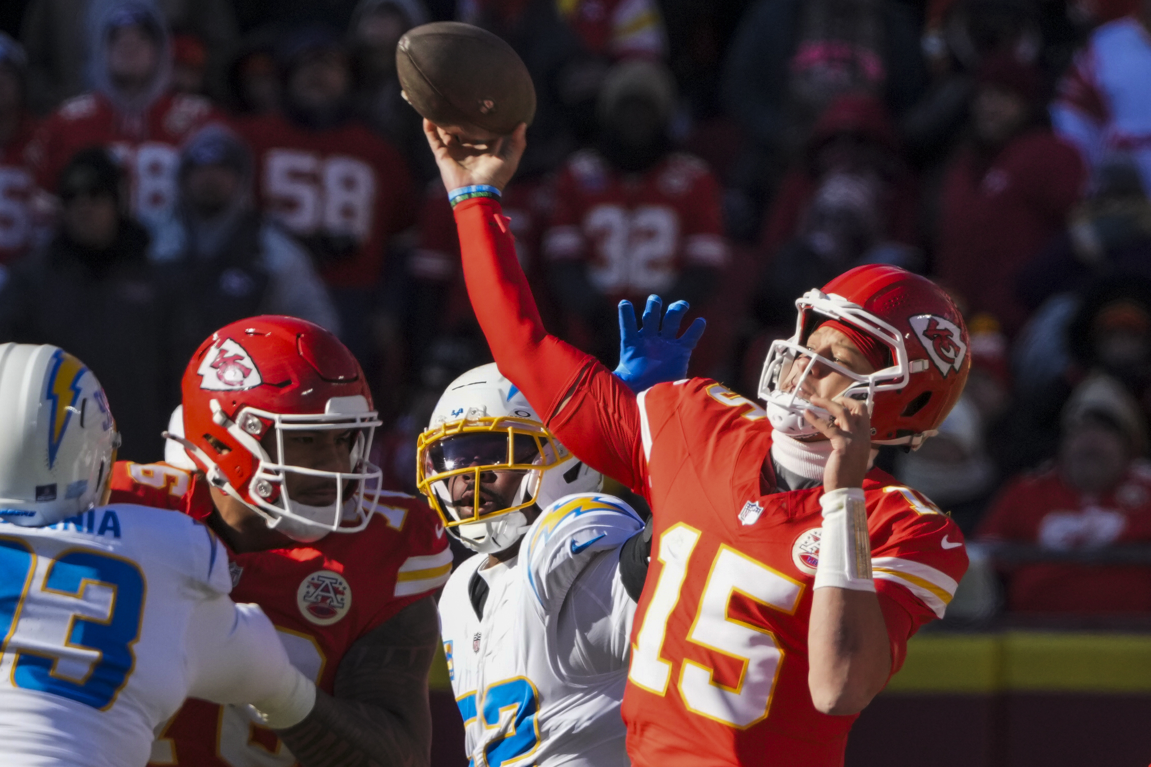 Dec 14, 2025; Kansas City, Missouri, USA; Kansas City Chiefs quarterback Patrick Mahomes (15) throws a pass during the second half against the Los Angeles Chargers at GEHA Field at Arrowhead Stadium. Mandatory Credit: Jay Biggerstaff-Imagn Images