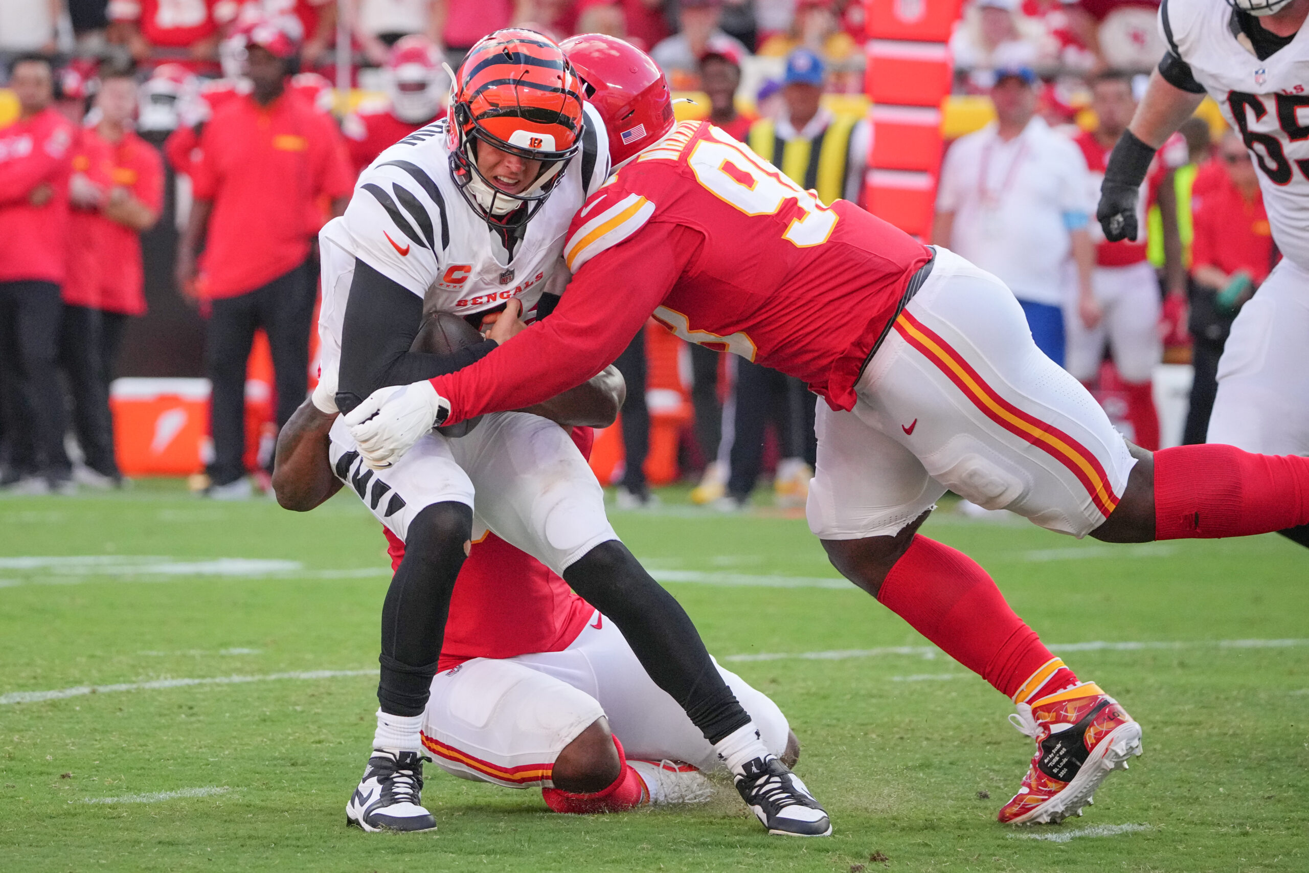 Sep 15, 2024; Kansas City, Missouri, USA; Cincinnati Bengals quarterback Joe Burrow (9) is tackled by defensive end Mike Danna (51) and defensive tackle Tershawn Wharton (98) during the second half at GEHA Field at Arrowhead Stadium. Mandatory Credit: Denny Medley-Imagn Images
