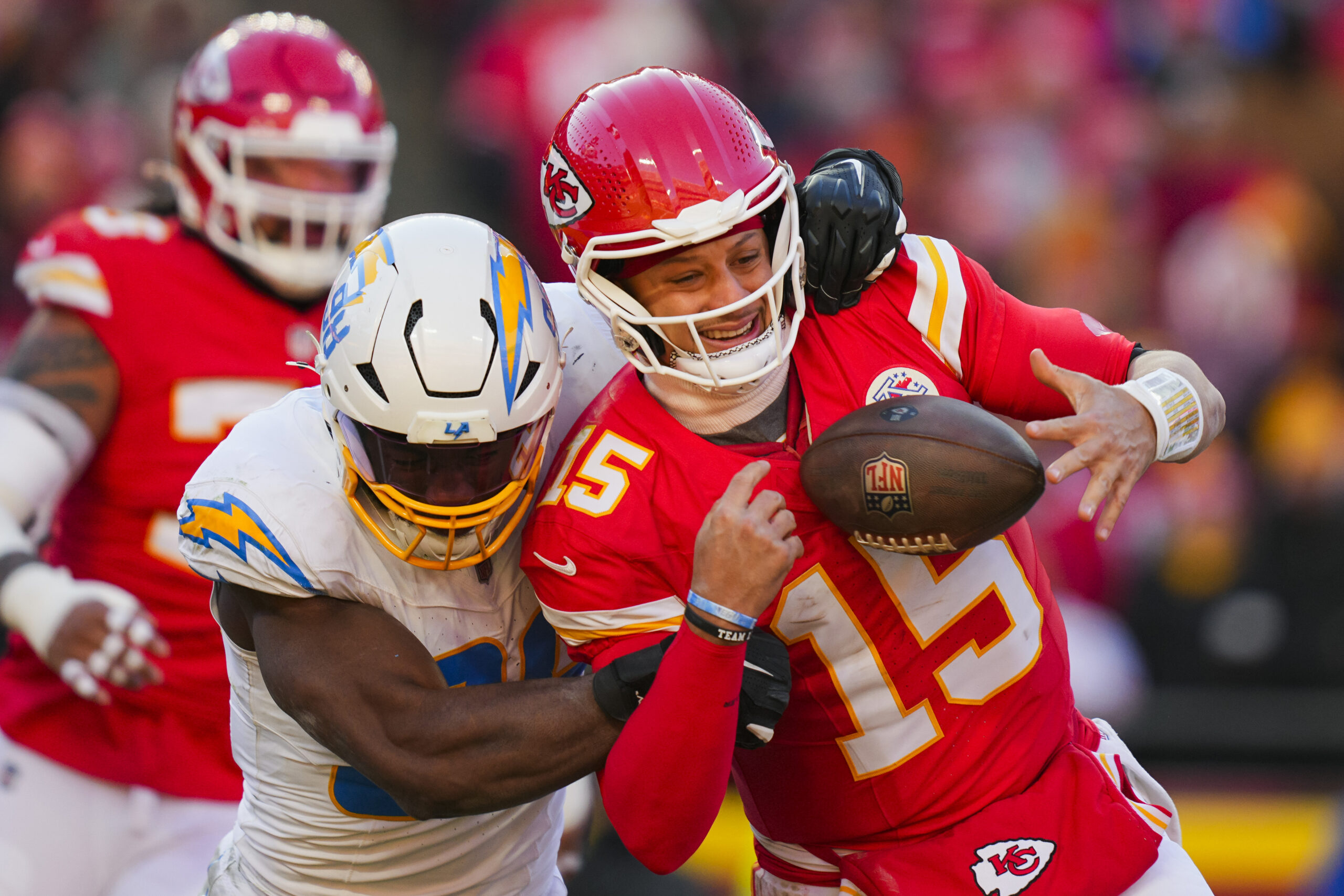 Dec 14, 2025; Kansas City, Missouri, USA; Kansas City Chiefs quarterback Patrick Mahomes (15) is sacked by Los Angeles Chargers linebacker Odafe Oweh (98) during the second half at GEHA Field at Arrowhead Stadium. Mandatory Credit: Jay Biggerstaff-Imagn Images