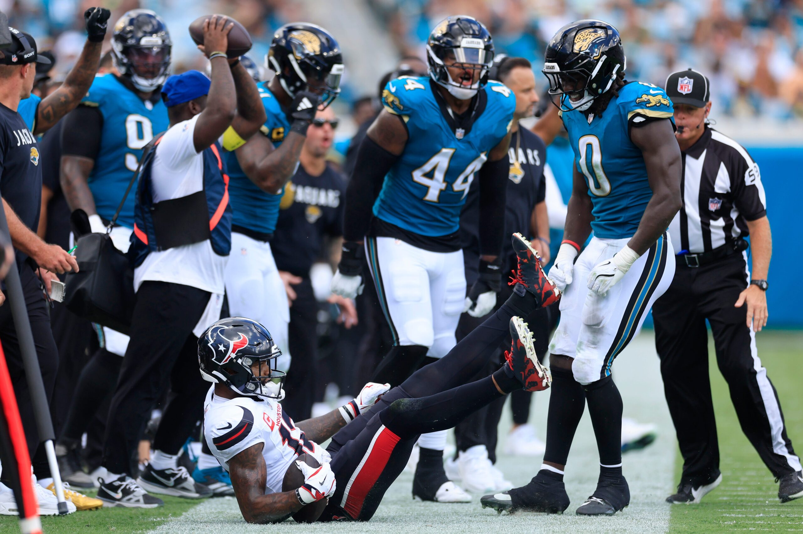 Houston Texans wide receiver Nico Collins (12) is shoved out of bounds by Jacksonville Jaguars linebacker Devin Lloyd (0) during the first quarter of an NFL football matchup at EverBank Stadium, Sunday, Sept. 21, 2025, in Jacksonville, Fla. The Jaguars defeated the Texans 17-10.-Imagn Images