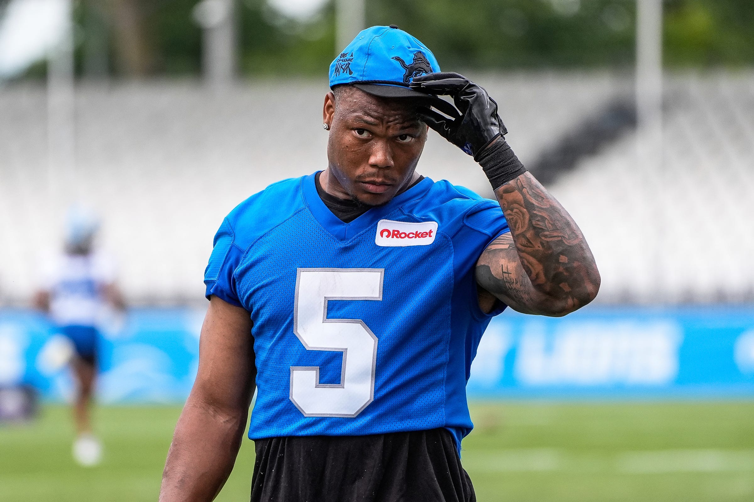 Detroit Lions running back David Montgomery (5) walks off the field after practice during training camp at Meijer Performance Center in Allen Park on Sunday, July 20, 2025.-Imagn Images