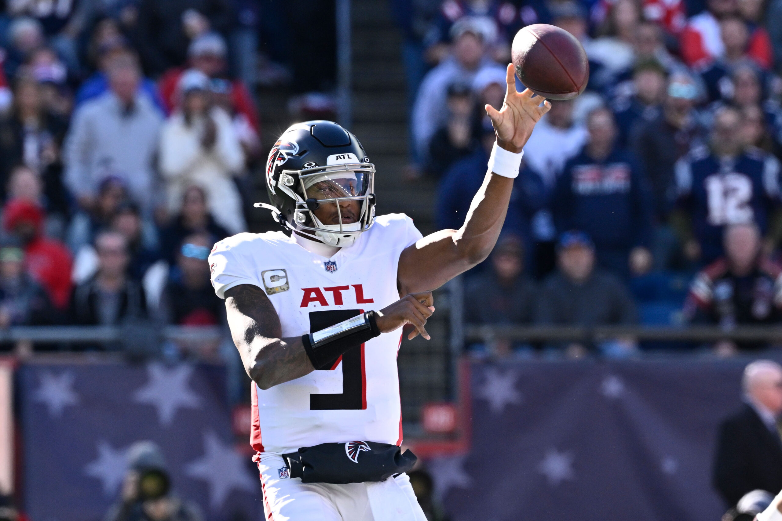 Nov 2, 2025; Foxborough, Massachusetts, USA; Atlanta Falcons quarterback Michael Penix Jr. (9) throws a pass against the New England Patriots during the first half at Gillette Stadium. Mandatory Credit: Eric Canha-Imagn Images