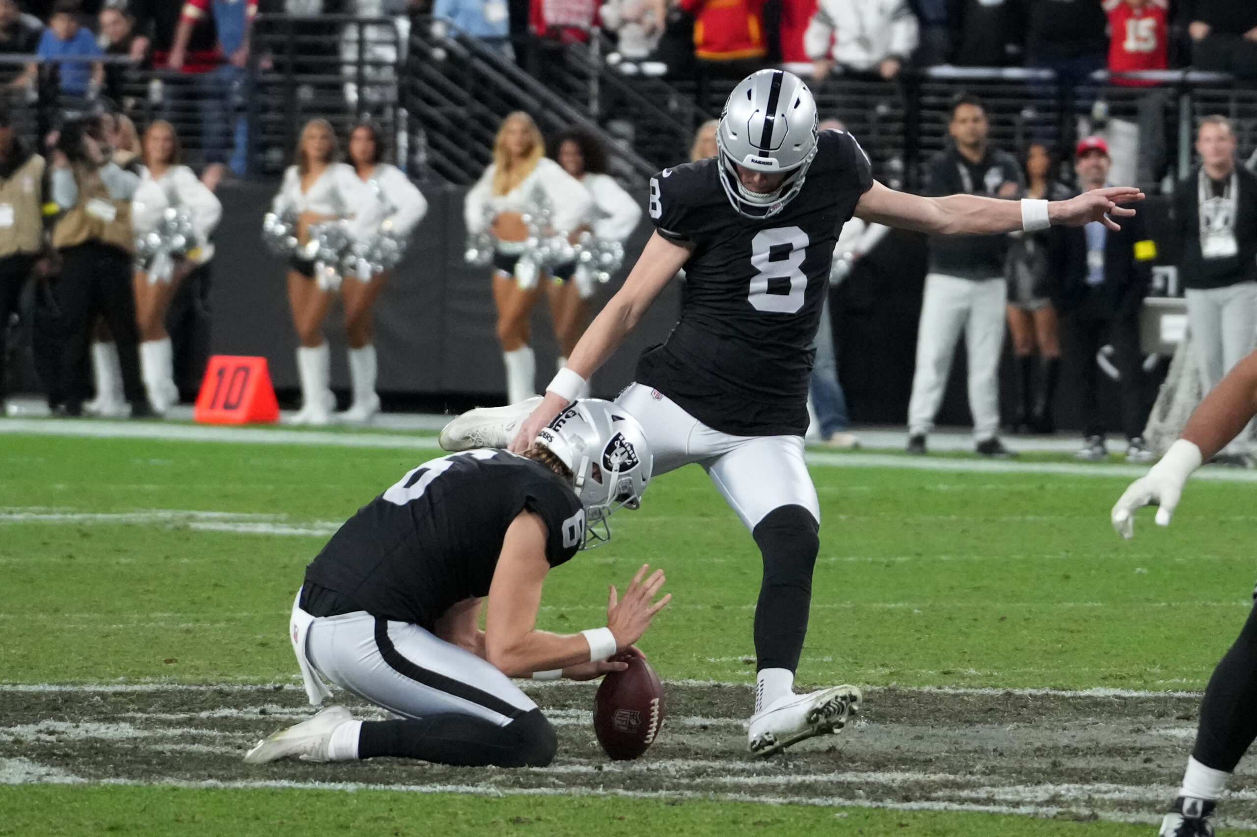 Jan 4, 2026; Paradise, Nevada, USA; Las Vegas Raiders place kicker Daniel Carlson (8) kicks a 60-yard field goal out of the hold of punter AJ Cole (6) with eight seconds left against the Kansas City Chiefs at Allegiant Stadium. Mandatory Credit: Kirby Lee-Imagn Images