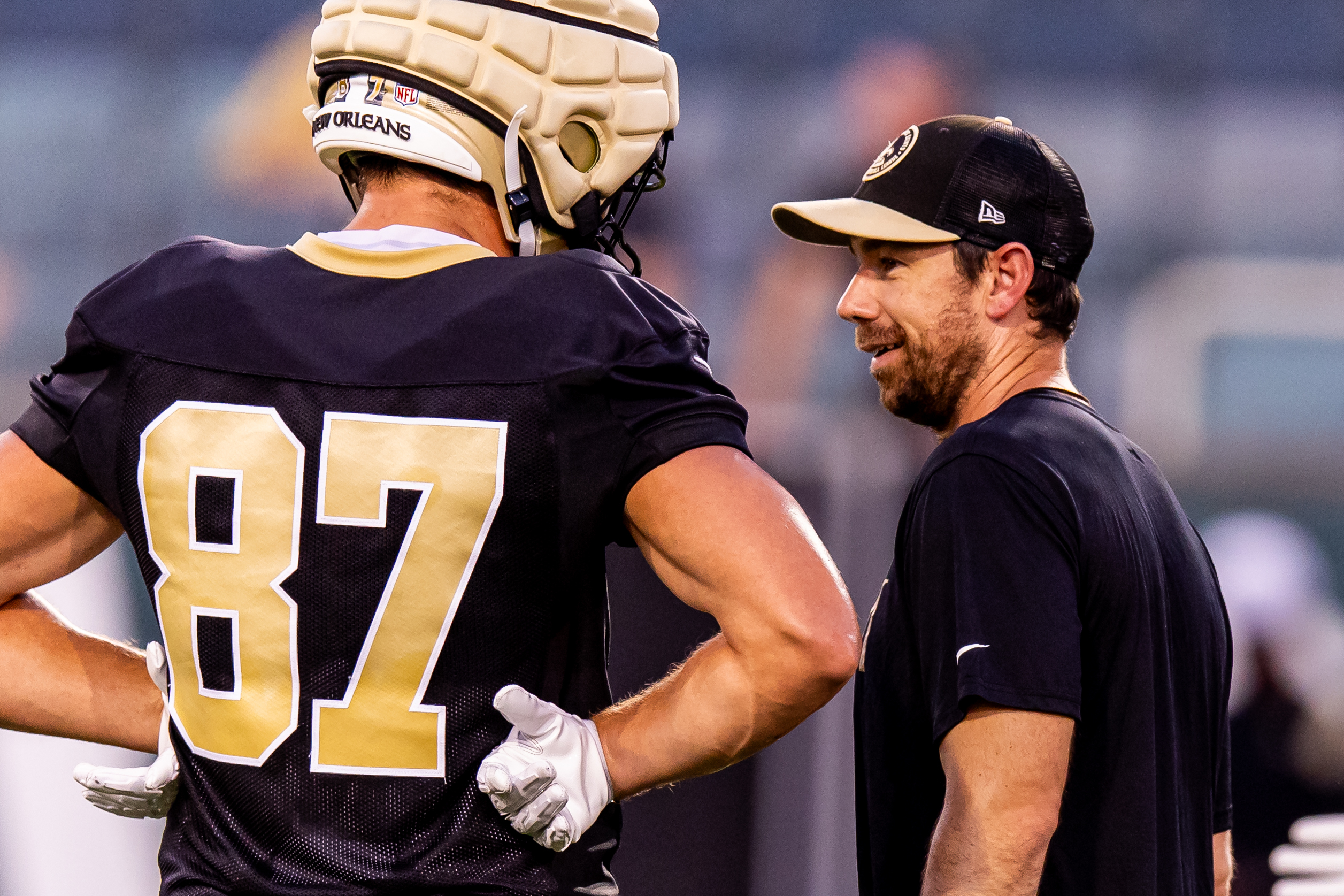 Aug 20, 2024; New Orleans, LA, USA; New Orleans Saints offensive coordinator Klint Kubiak talks to tight end Foster Moreau (87) during practice at Yulman Stadium (Tulane). Mandatory Credit: Stephen Lew-Imagn Images