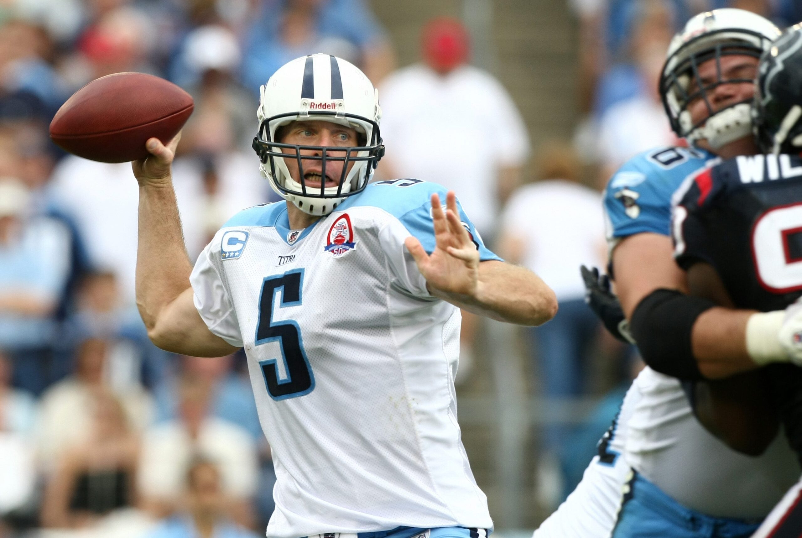 Tennessee Titans quarterback Kerry Collins (5) his set to throws a pass against the Houston Texans at LP Field in Nashville on Sept. 20, 2009. The Titans lost their home opener 34-31.
