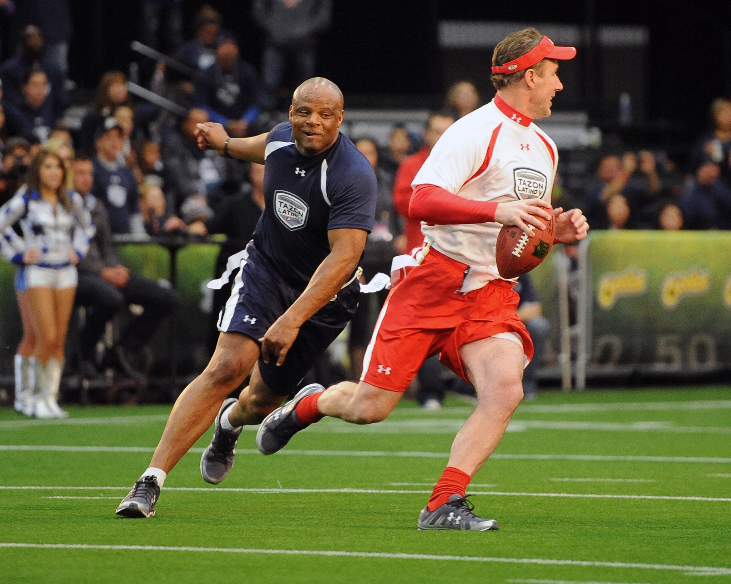 Feb 2, 2011; Dallas, TX, USA; Rich Gannon is pressured by Warren Moon in the Tazon Latino V flag football game at the NFL Experience for Super Bowl XLV at the Dallas Convention Center. Mandatory Credit: Kirby Lee/Image of Sport-Imagn Images