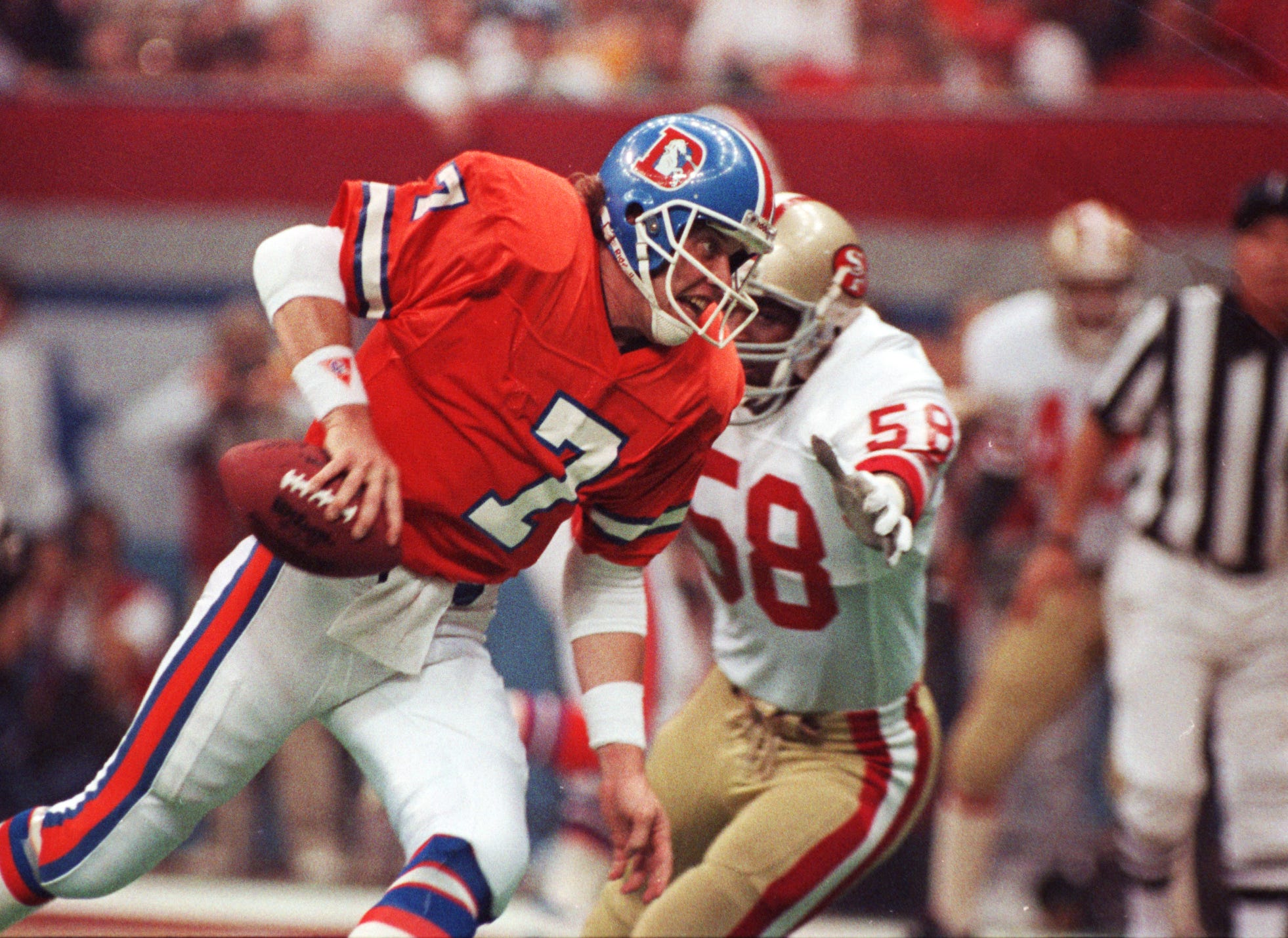Denver Broncos quarterback John Elway scrambles during Super Bowl XXIV against the San Francisco 49ers on Jan. 28, 1990 in New Orleans.