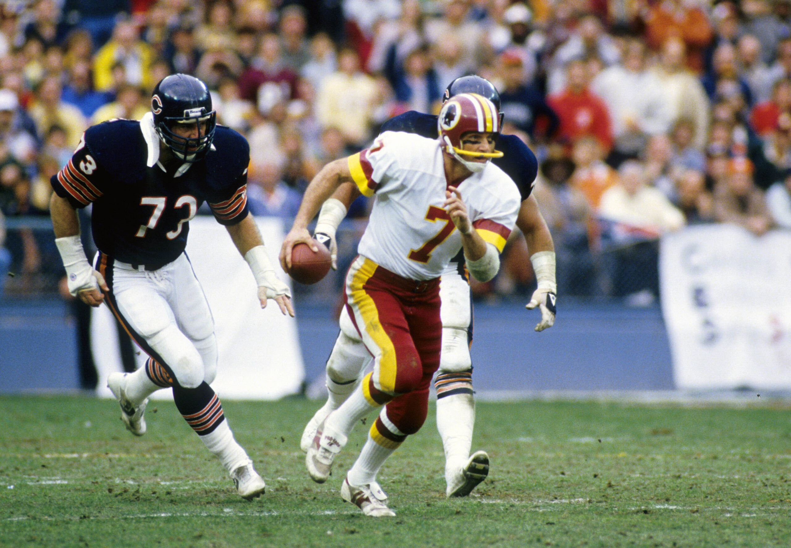 Dec 30, 1984; Washington, DC, USA; FILE PHOTO; Washington Redskins quarterback Joe Theismann (7) in action against the Chicago Bears during the 1984 NFC Divisional Playoff Game at RFK Stadium. The Bears won 23-19. Mandatory Credit: Manny Rubio-Imagn Images