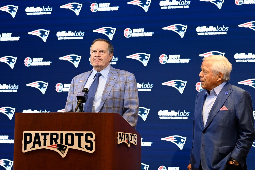 Jan 11, 2024; Foxborough, MA, USA; New England Patriots former head coach Bill Belichick (left) and Patriots owner Robert Kraft (right) hold a press conference at Gillette Stadium to announce Belichick’s exit from the team. Mandatory Credit: Eric Canha-USA TODAY Sports