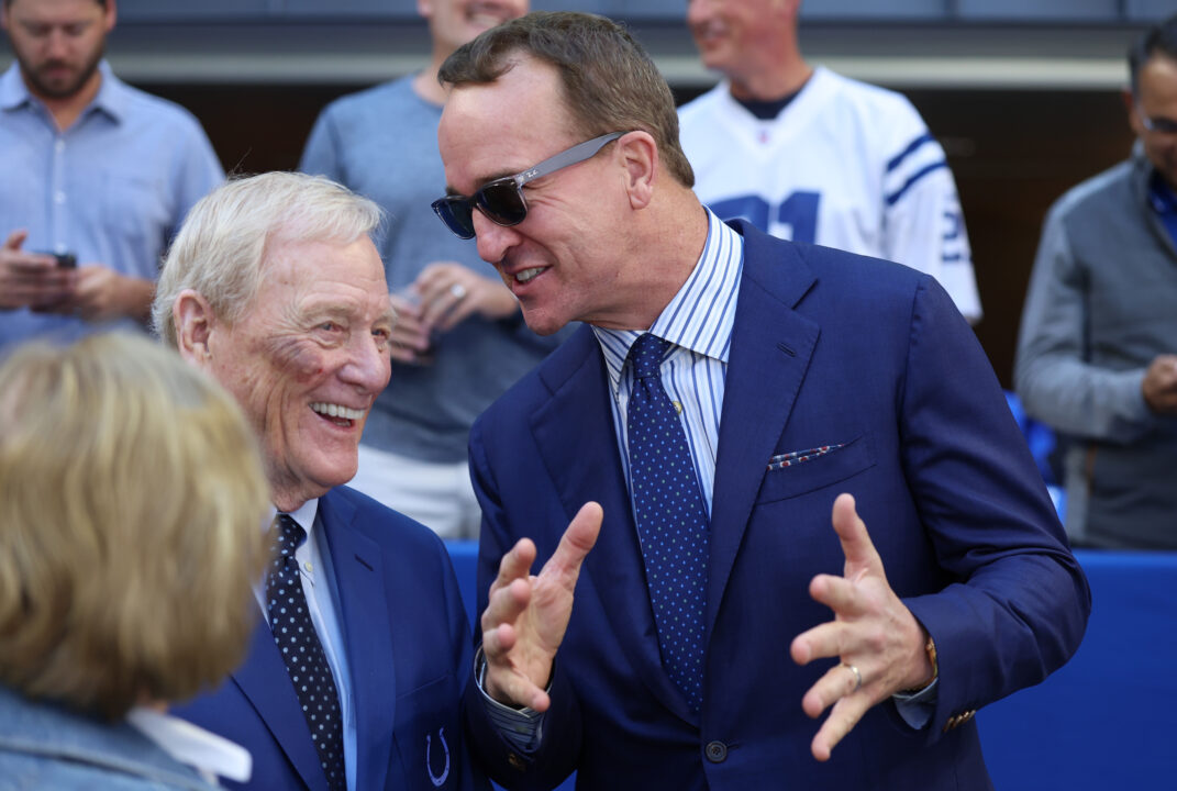 Sep 7, 2025; Indianapolis, Indiana, USA; Former Indianapolis Colts general manager Bill Polian and former quarterback Peyton Manning before a game against the Miami Dolphins at Lucas Oil Stadium. Mandatory Credit: Trevor Ruszkowski-Imagn Images