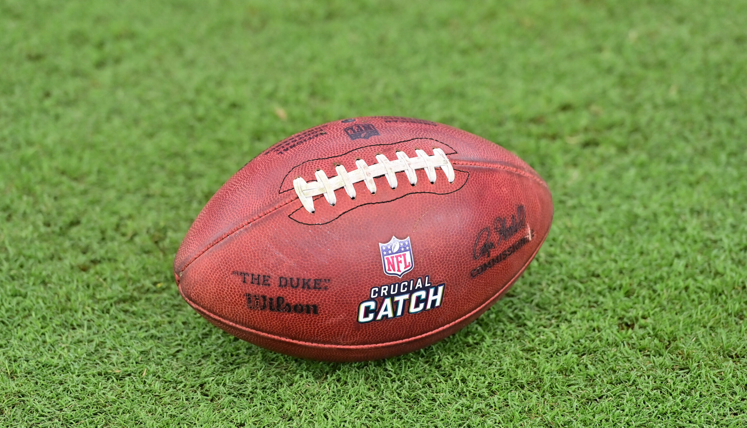 Oct 5, 2025; Glendale, Arizona, USA; An NFL football with the Crucial Catch logo lies on the turf during the game between the Arizona Cardinals and the Tennessee Titans in the first quarter at State Farm Stadium. Mandatory Credit: Matt Kartozian-Imagn Images