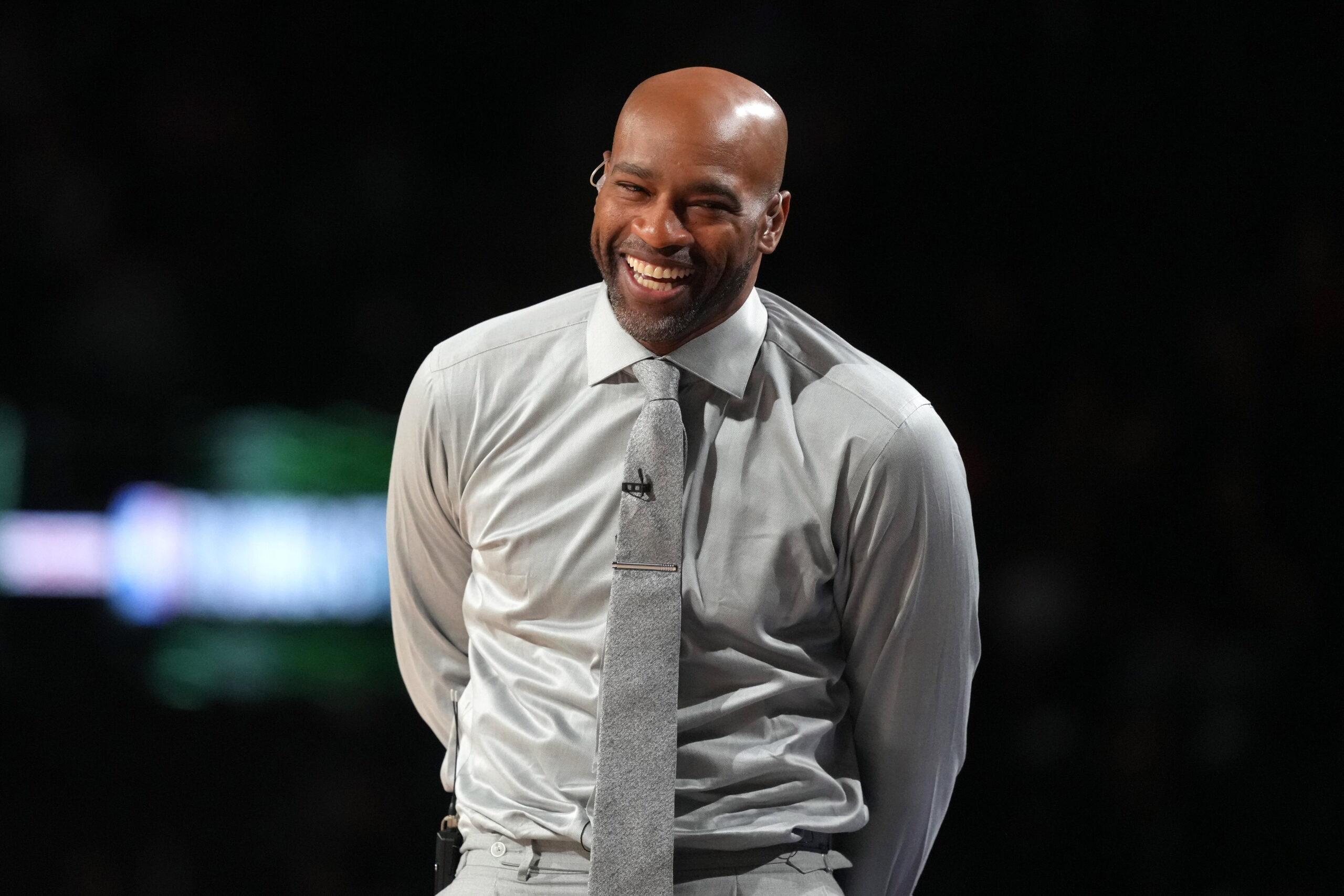 Feb 13, 2026; Inglewood, California, USA; Team Vince honorary coach Vince Carter looks on during an NBA All Star Rising Stars game at Intuit Dome. Mandatory Credit: Kirby Lee-Imagn Images