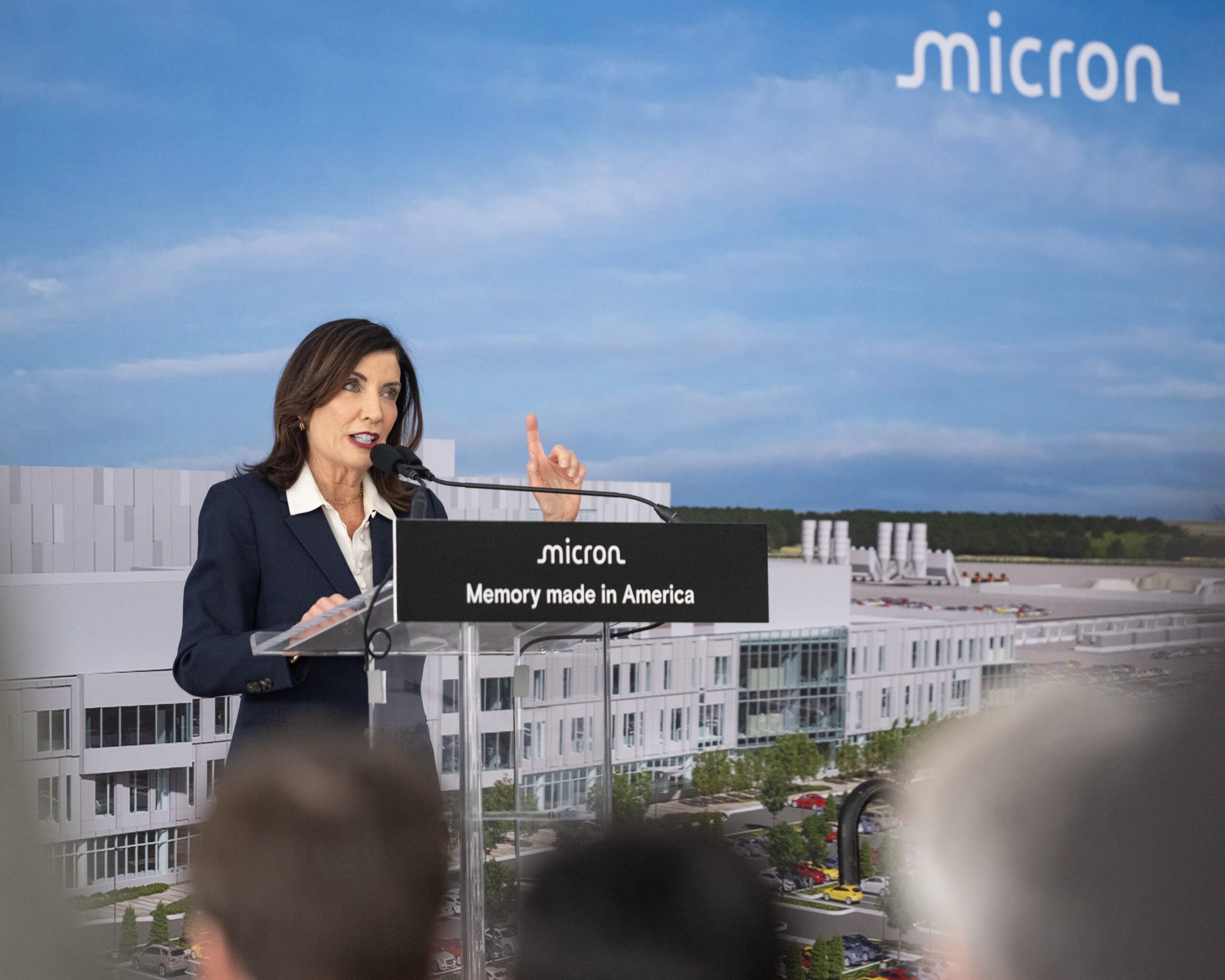 New York State Governor Kathy Hochul addresses the crowd at White Pine Commerce Park in Clay, NY during Micron’s groundbreaking ceremony on Friday, January 16, 2026. Mandatory Credit: Daniel DeLoach/Utica Observer-Dispatch-Imagn Images
