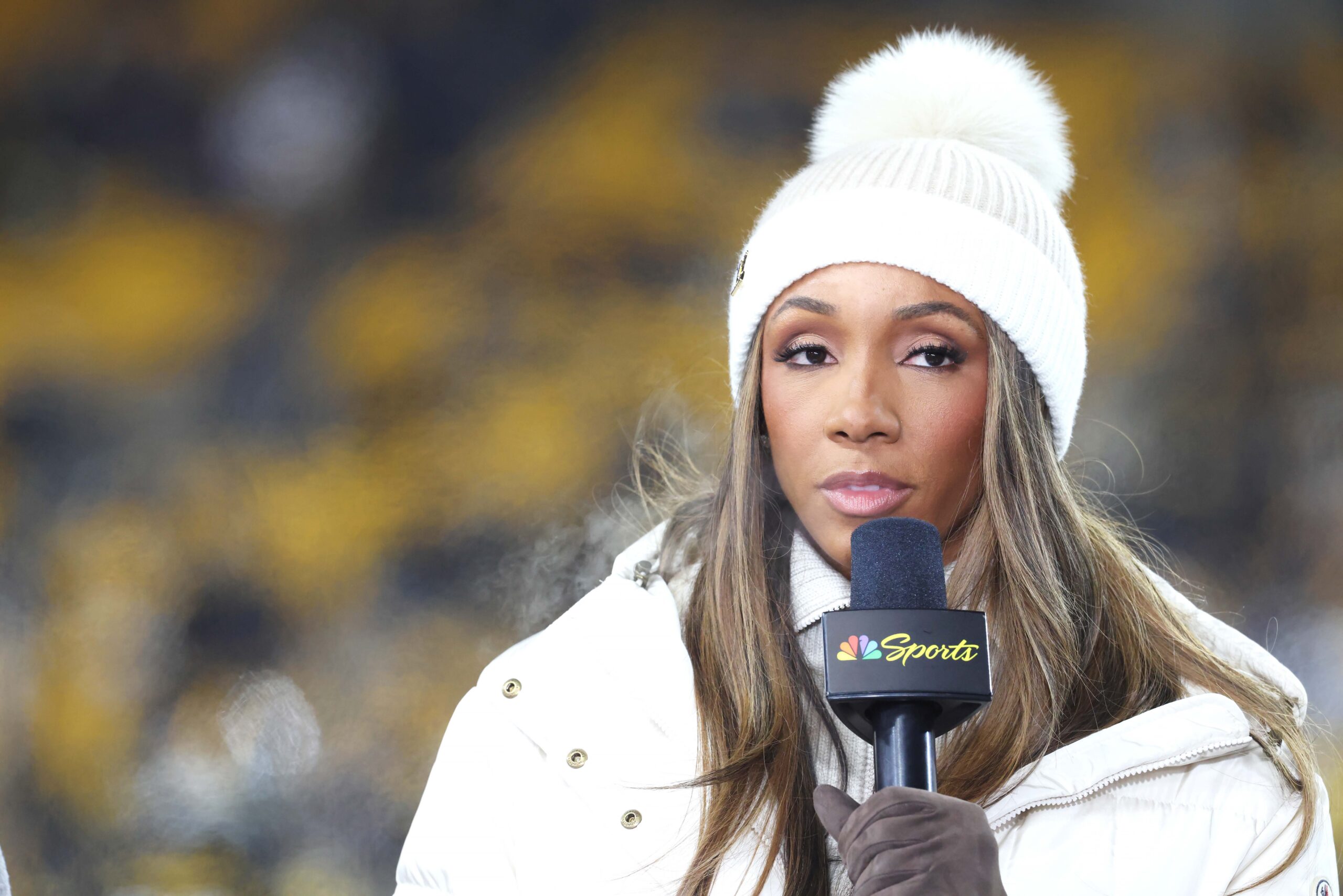 Jan 4, 2026; Pittsburgh, Pennsylvania, USA; NBC Sunday Football Night in America commentator Maria Taylor performs the pre-game show before the Pittsburgh Steelers host the Baltimore Ravens at Acrisure Stadium. Mandatory Credit: Charles LeClaire-Imagn Images