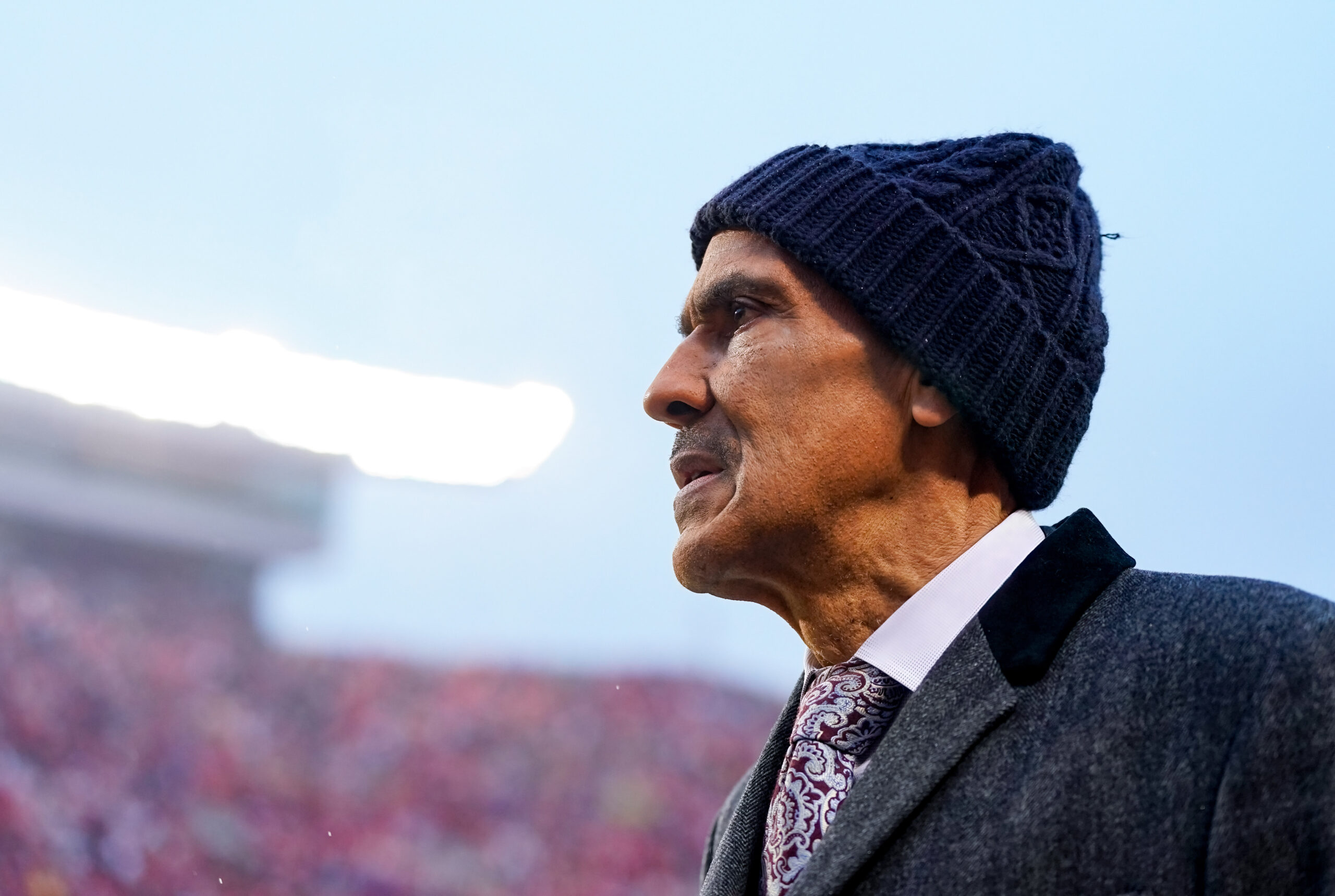 Jan 21, 2023; Kansas City, Missouri, USA; NBC Sports commentator Tony Dungy watches the action during the first half of an AFC divisional round game between the Jacksonville Jaguars and the Kansas City Chiefs at GEHA Field at Arrowhead Stadium. Mandatory Credit: Jay Biggerstaff-Imagn Images
