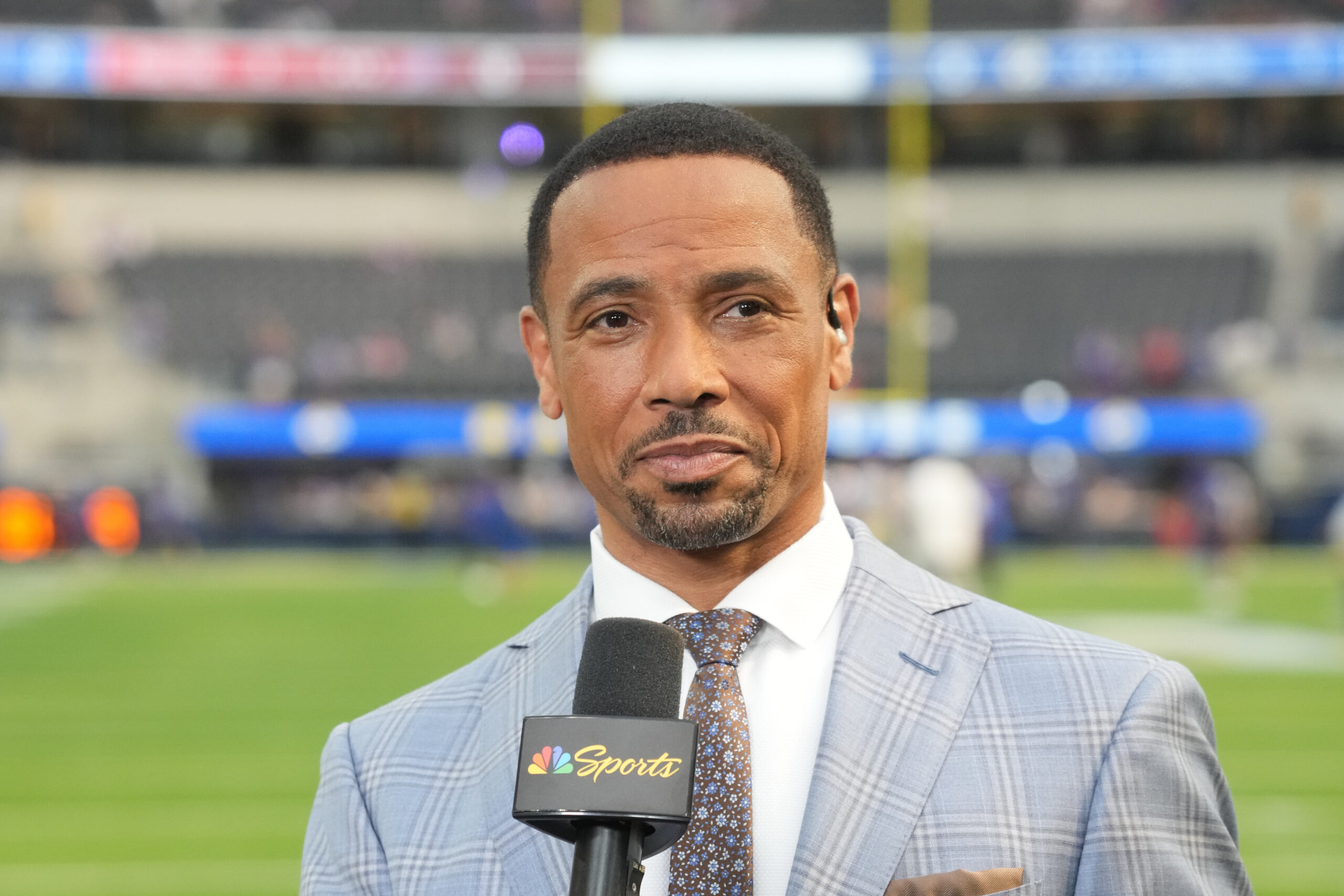Sep 8, 2022; Inglewood, California, USA; NBC sports caster Rodney Harrison before the game between the Los Angeles Rams and the Buffalo Bills at SoFi Stadium. Mandatory Credit: Kirby Lee-Imagn Images