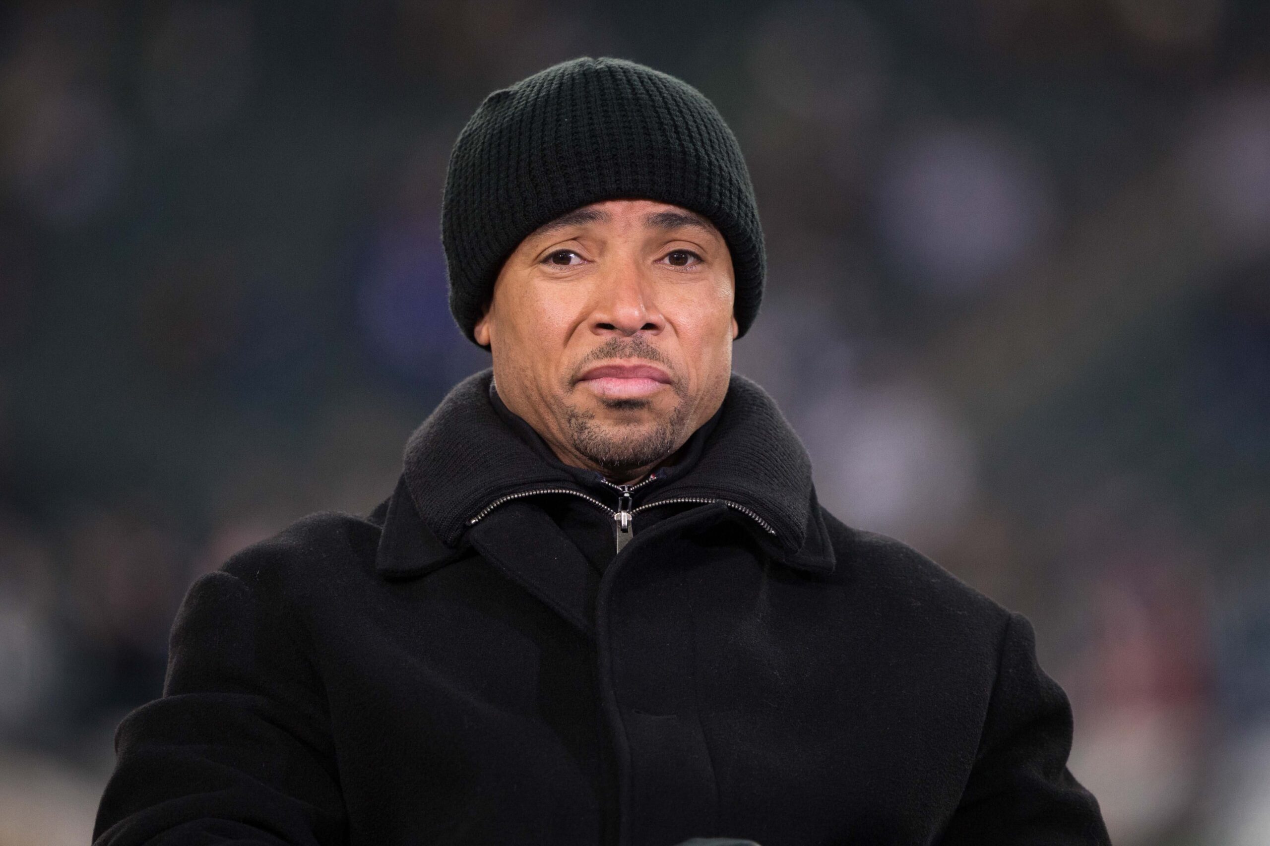 Oct 9, 2022; Baltimore, Maryland, USA; Rodney Harrison, American sports broadcaster and former professional football player, on the sidelines before the game between the Baltimore Ravens and the Cincinnati Bengals at M&T Bank Stadium. Mandatory Credit: Tommy Gilligan-Imagn Images