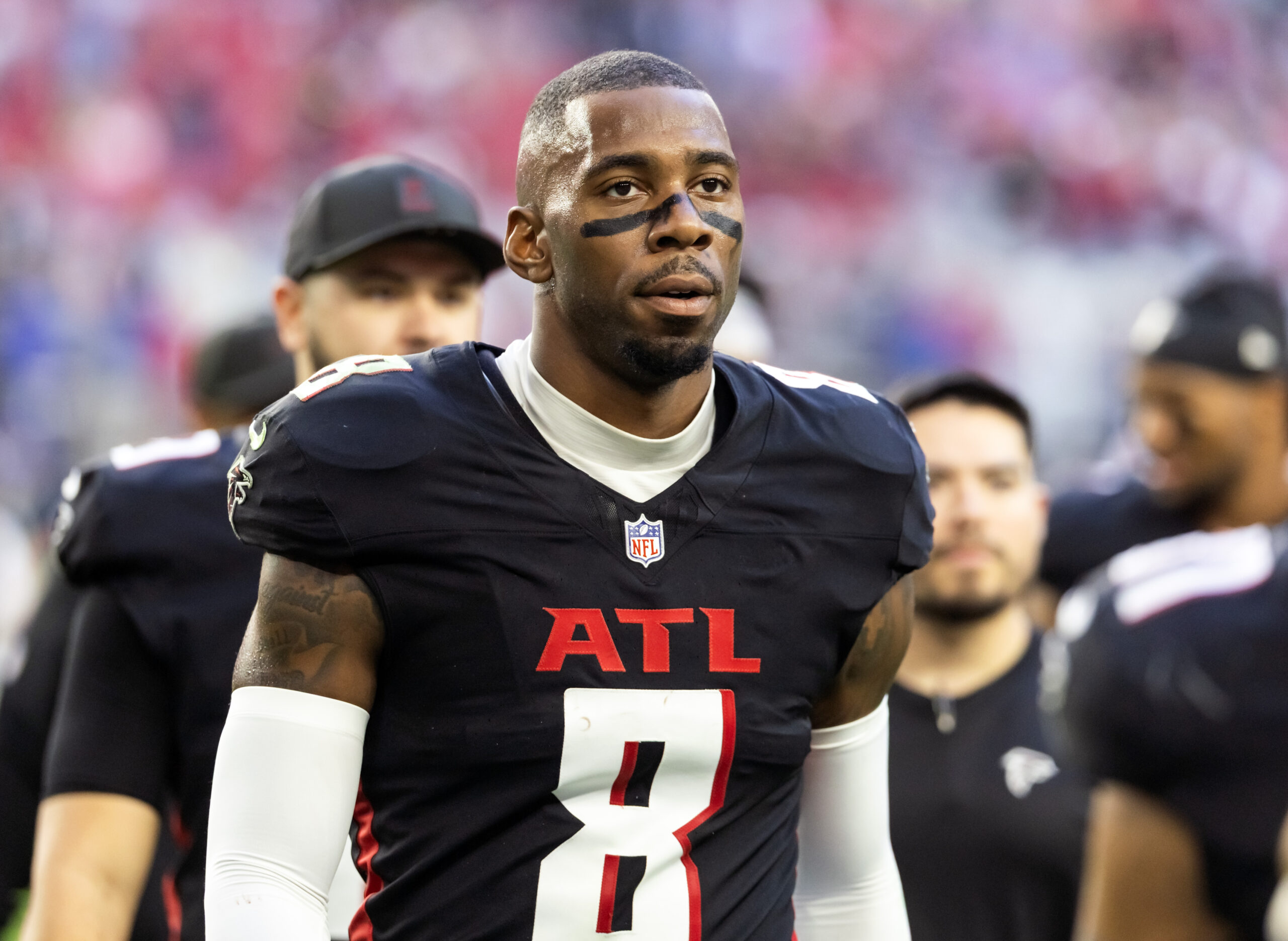 Dec 21, 2025; Glendale, Arizona, USA; Atlanta Falcons tight end Kyle Pitts Sr. (8) against the Arizona Cardinals at State Farm Stadium. Mandatory Credit: Mark J. Rebilas-Imagn Images