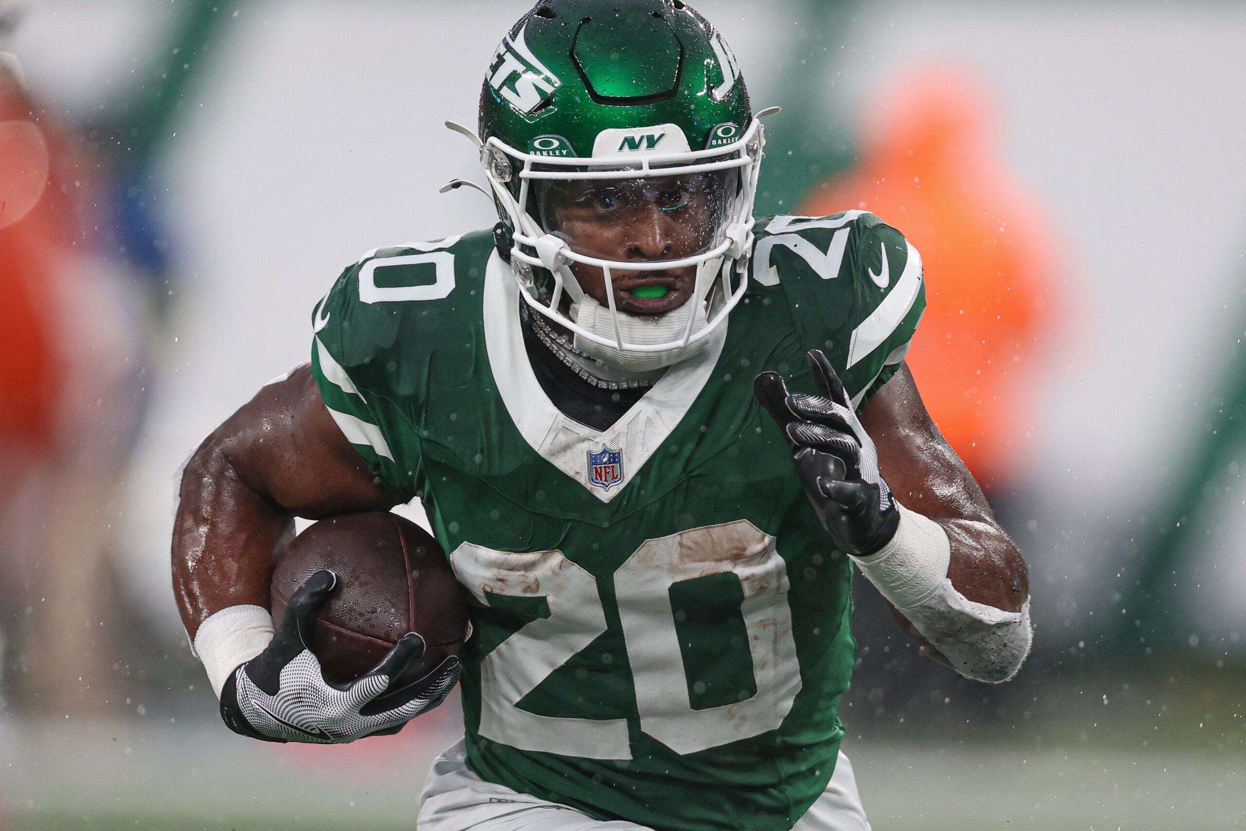 Nov 9, 2025; East Rutherford, New Jersey, USA; New York Jets running back Breece Hall (20) carries the ball during the second half against the Cleveland Browns at MetLife Stadium. Mandatory Credit: Vincent Carchietta-Imagn Images