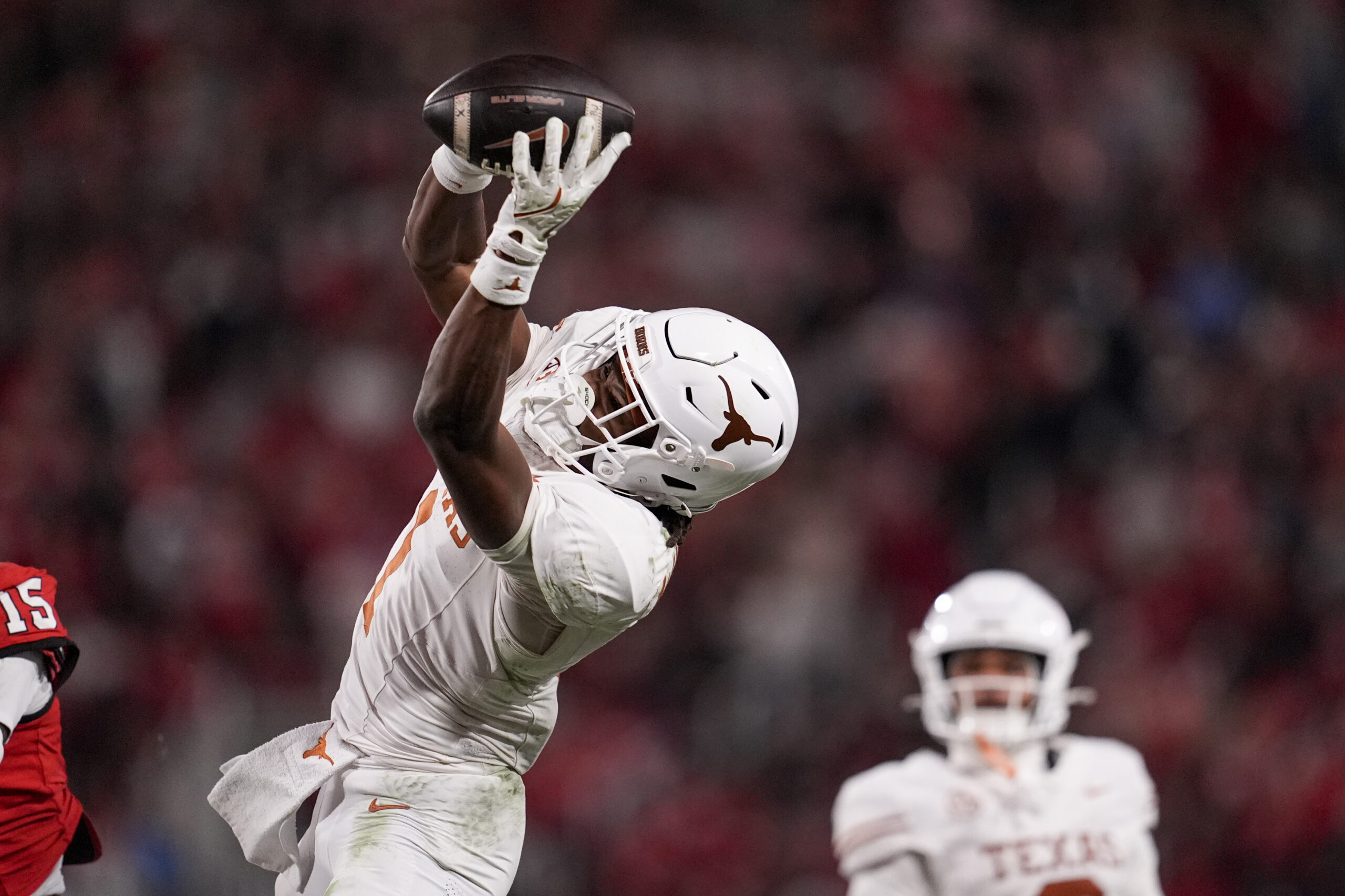 Nov 15, 2025; Athens, Georgia, USA; Texas Longhorns wide receiver Ryan Wingo (1) attempts to make a catch in the second half against the Georgia Bulldogs at Sanford Stadium. Mandatory Credit: Dale Zanine-Imagn Images