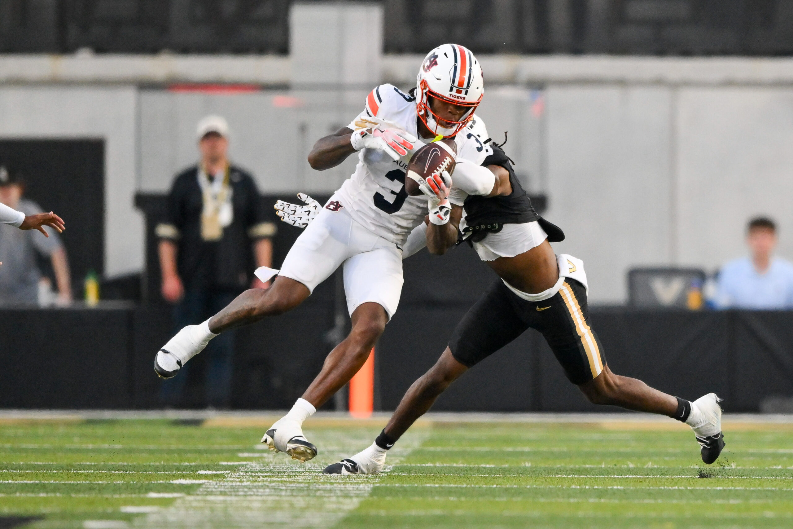 Nov 8, 2025; Nashville, Tennessee, USA; Auburn Tigers wide receiver Perry Thompson (3) makes a catch over the middle against the Vanderbilt Commodores during the first half at FirstBank Stadium. Mandatory Credit: Steve Roberts-Imagn Images