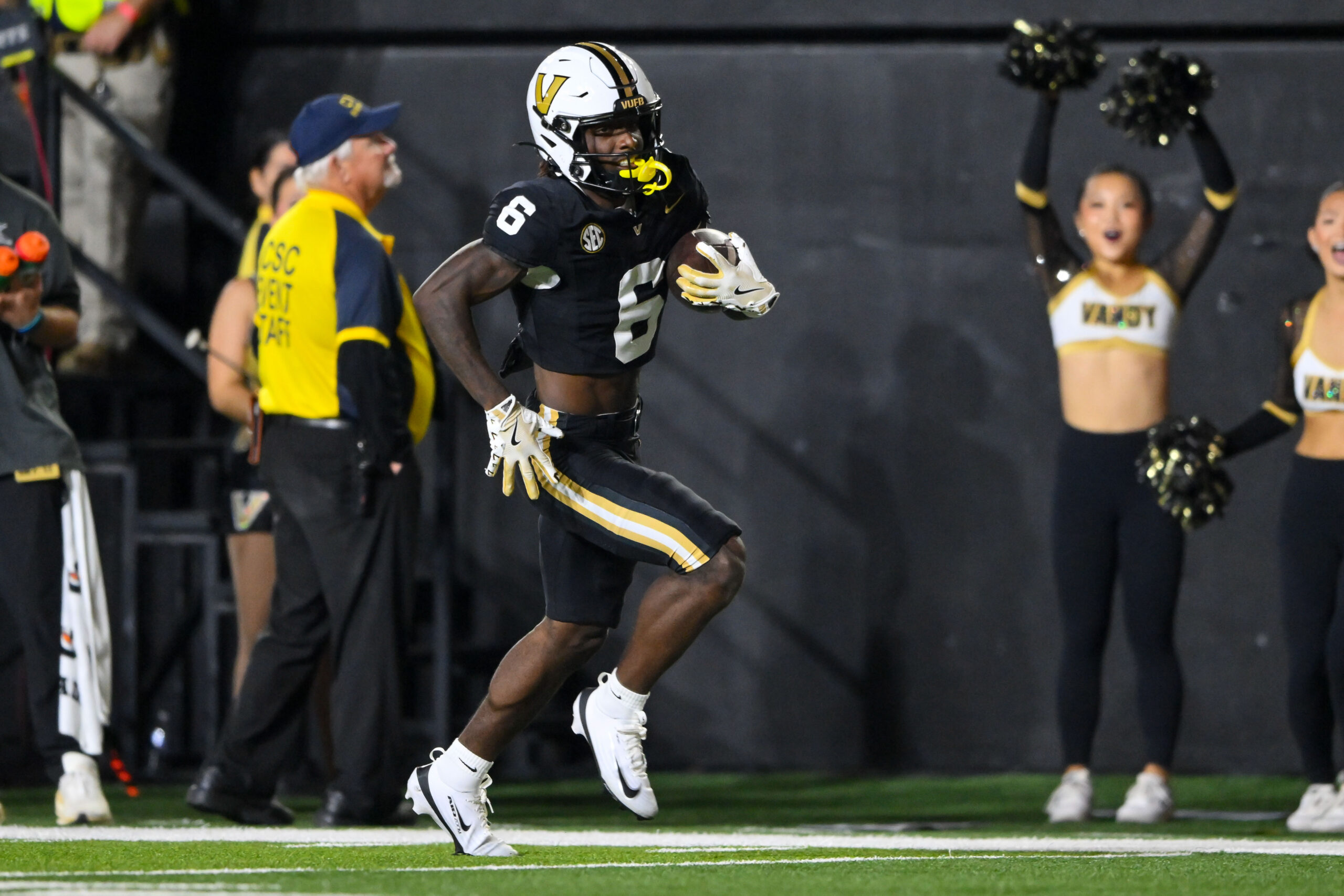 Nov 8, 2025; Nashville, Tennessee, USA; Auburn Tigers wide receiver Bryce Cain (6) makes a catch and scores a touchdown against the Auburn Tigers during the second half at FirstBank Stadium. Mandatory Credit: Steve Roberts-Imagn Images