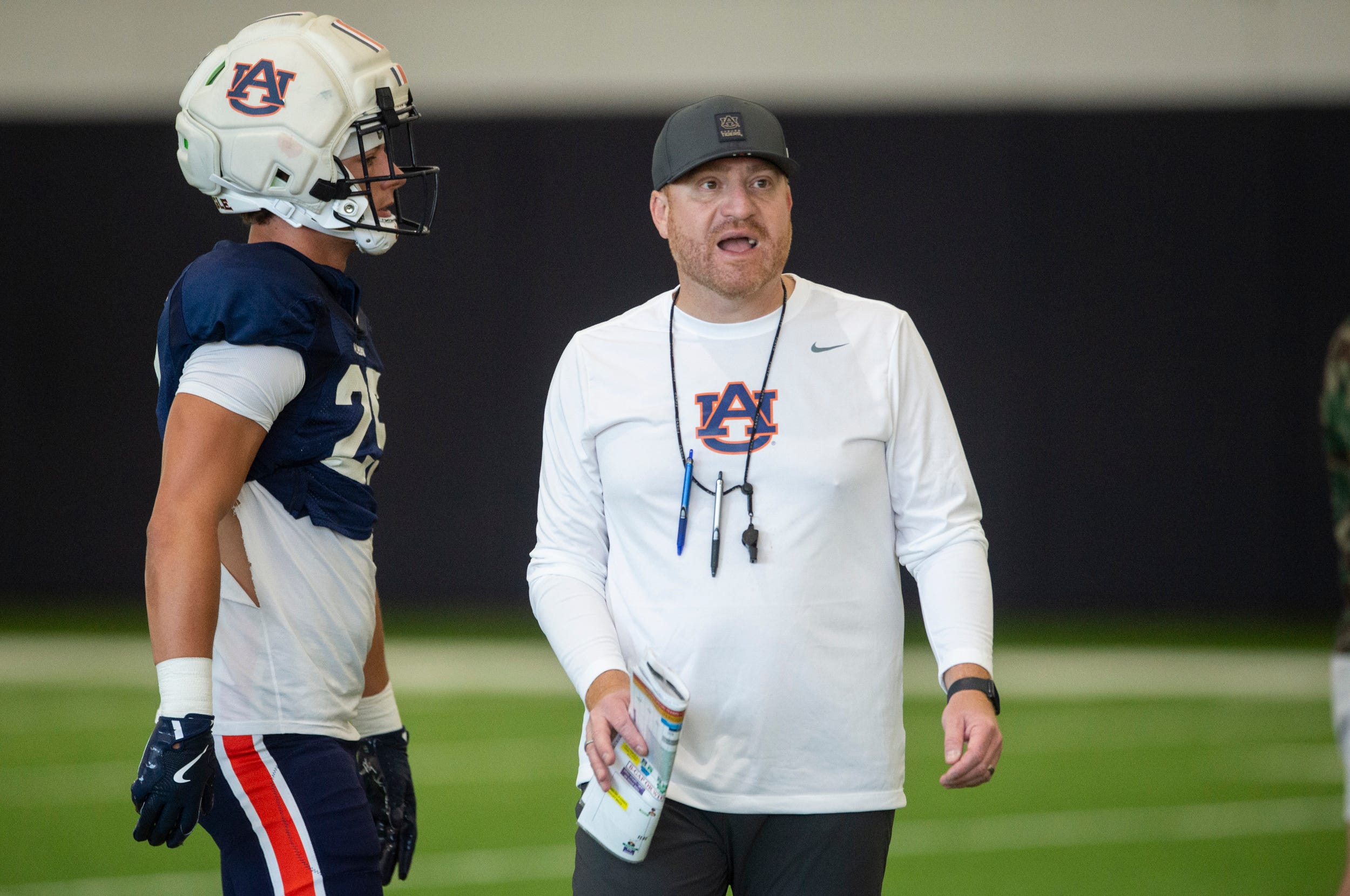 Auburn Tigers head coach Alex Golesh talks with his team during practice at Woltosz Football Performance Center in Auburn, Ala. on Thursday, April 16, 2026.