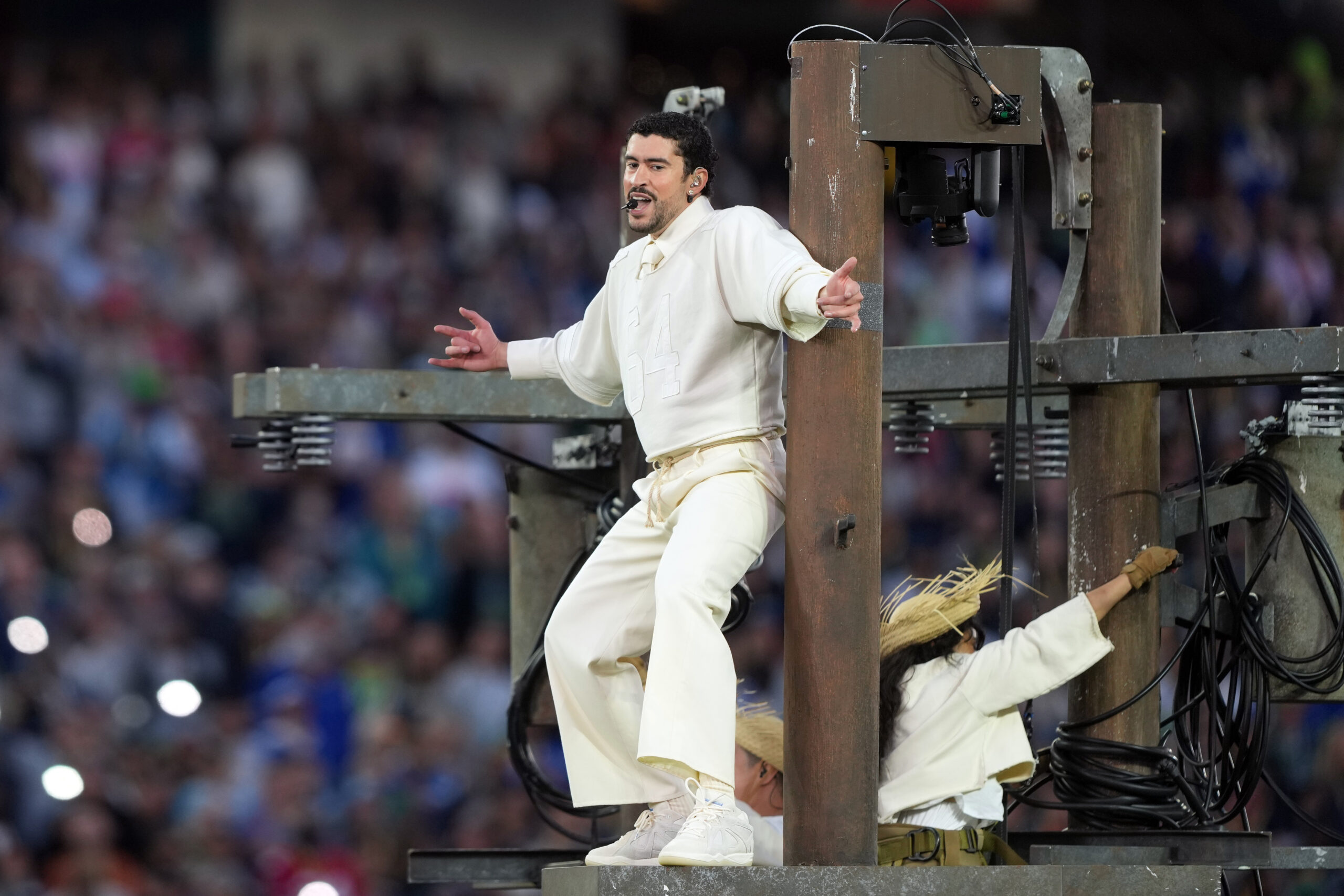 Feb 8, 2026; Santa Clara, CA, USA; Bad Bunny performs during halftime in Super Bowl LX between the New England Patriots and the Seattle Seahawks at Levi’s Stadium. Mandatory Credit: Darren Yamashita-Imagn Images